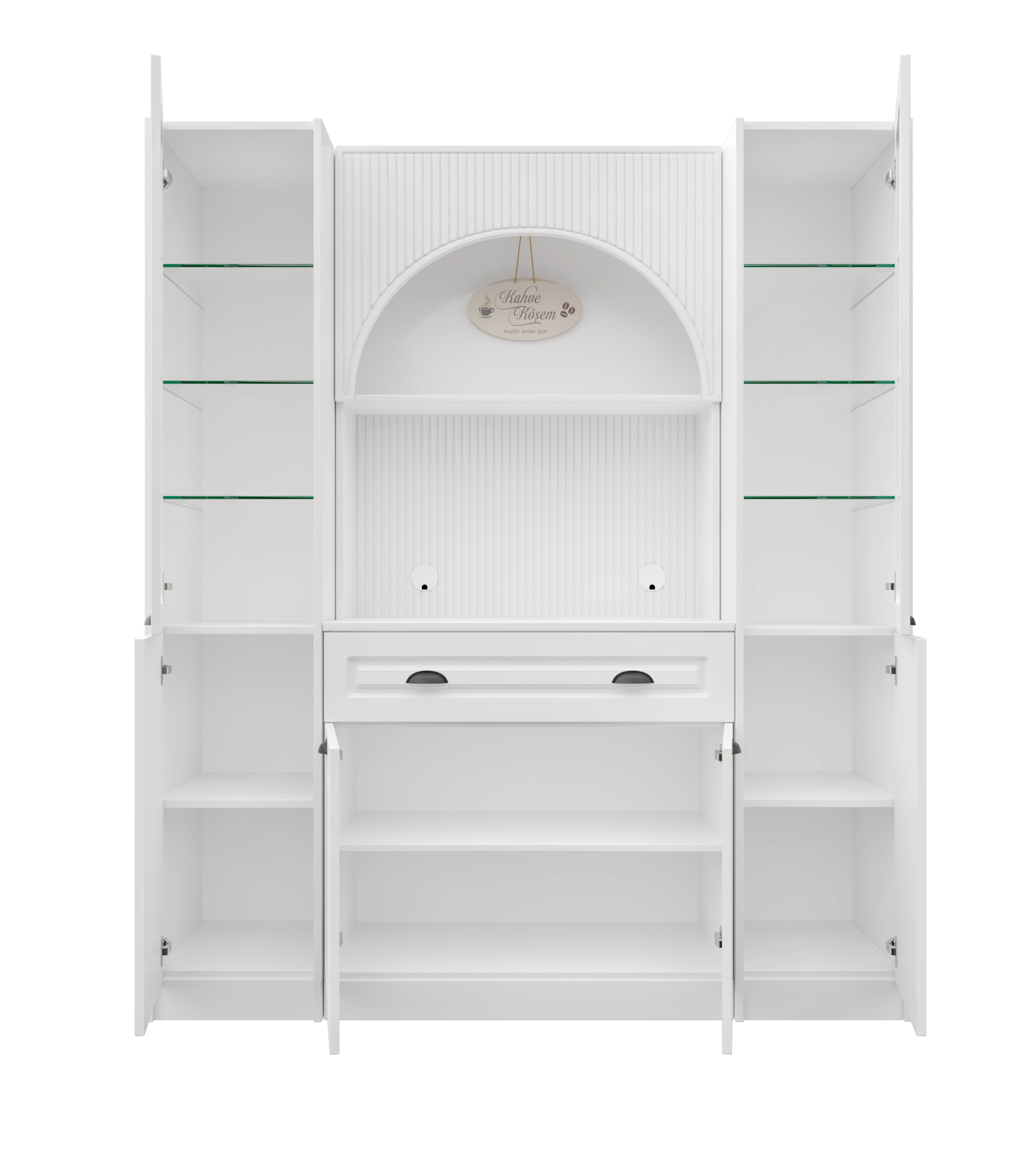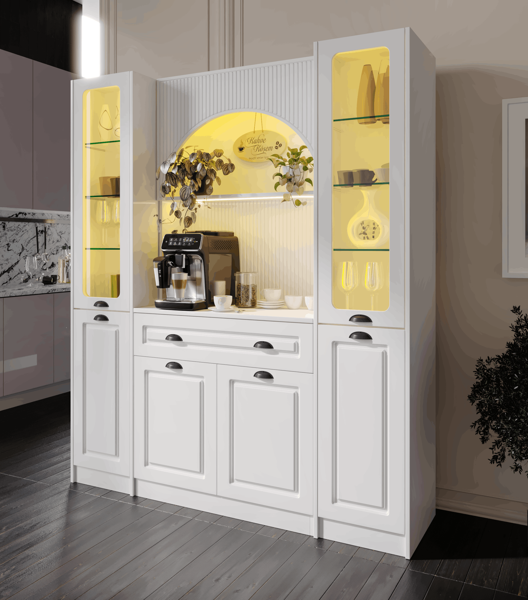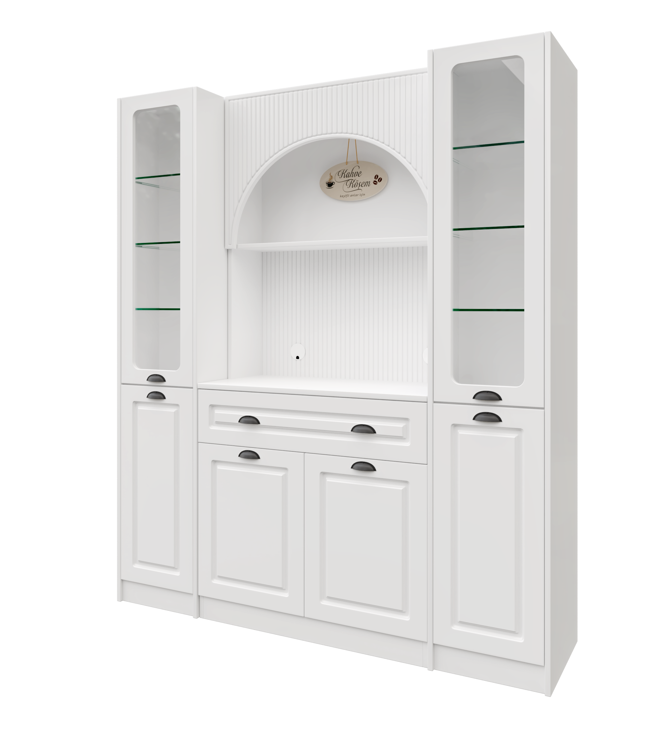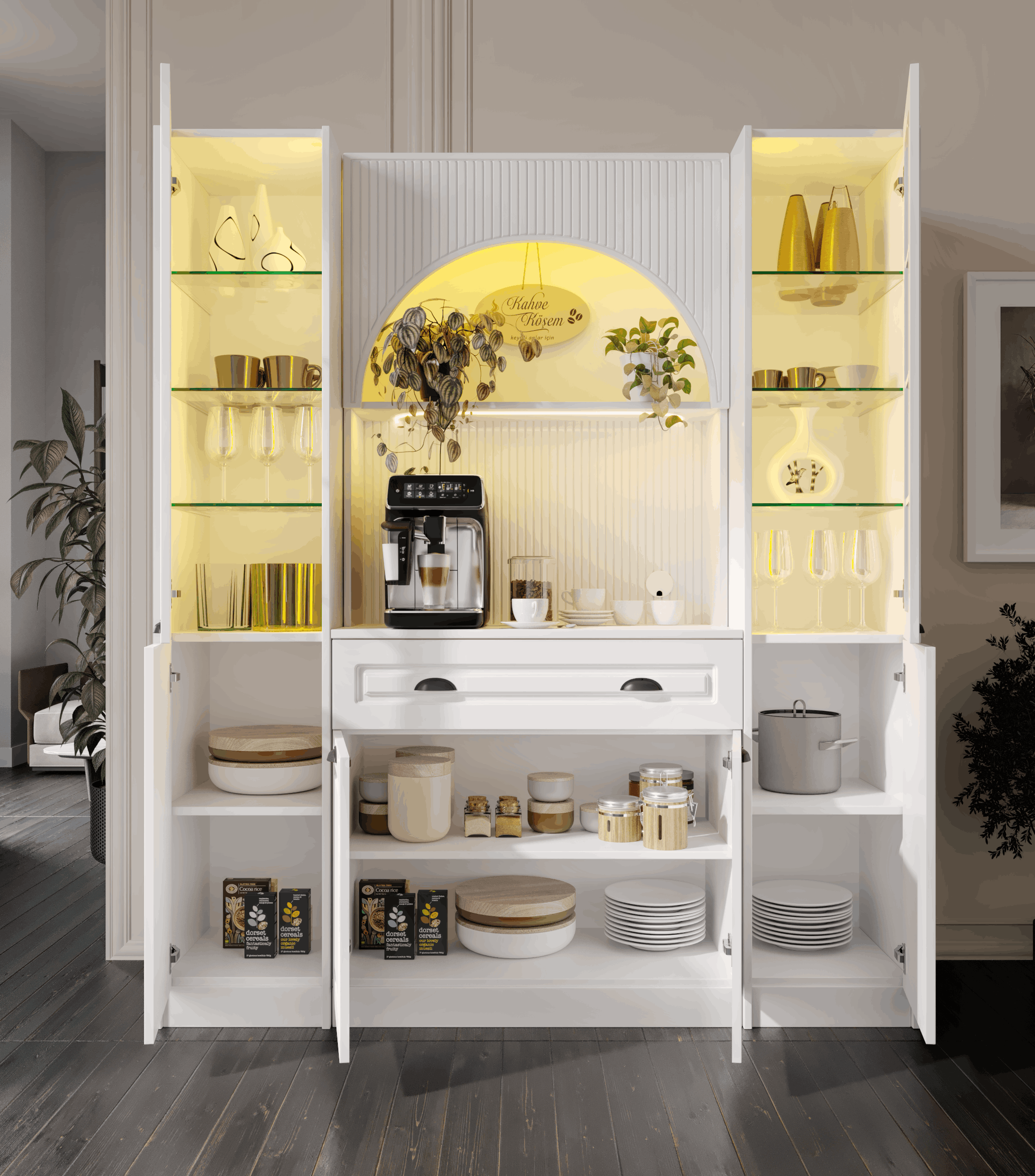 Orta bölümde yer alan kemer formuna sahip üst modül ve açık niş tasarımı, kahve makinesi ve günlük kullanım ürünleri için konforlu bir hazırlık alanı oluşturur. Alt modülde bulunan kapaklı dolap alanı; fincan, kahve ekipmanları ve aksesuarlar için düzenli ve gizli saklama imkânı sunar.