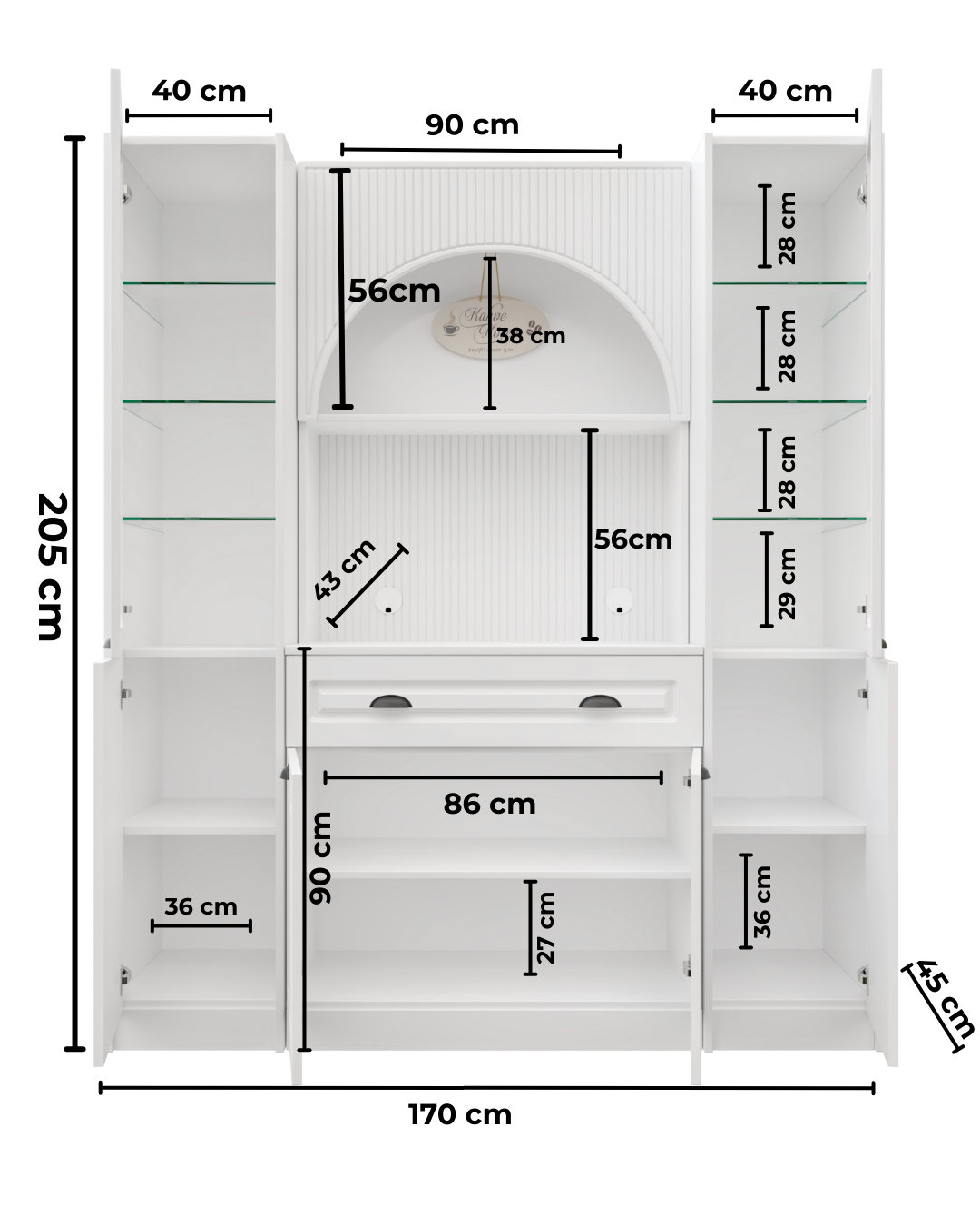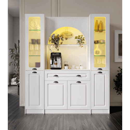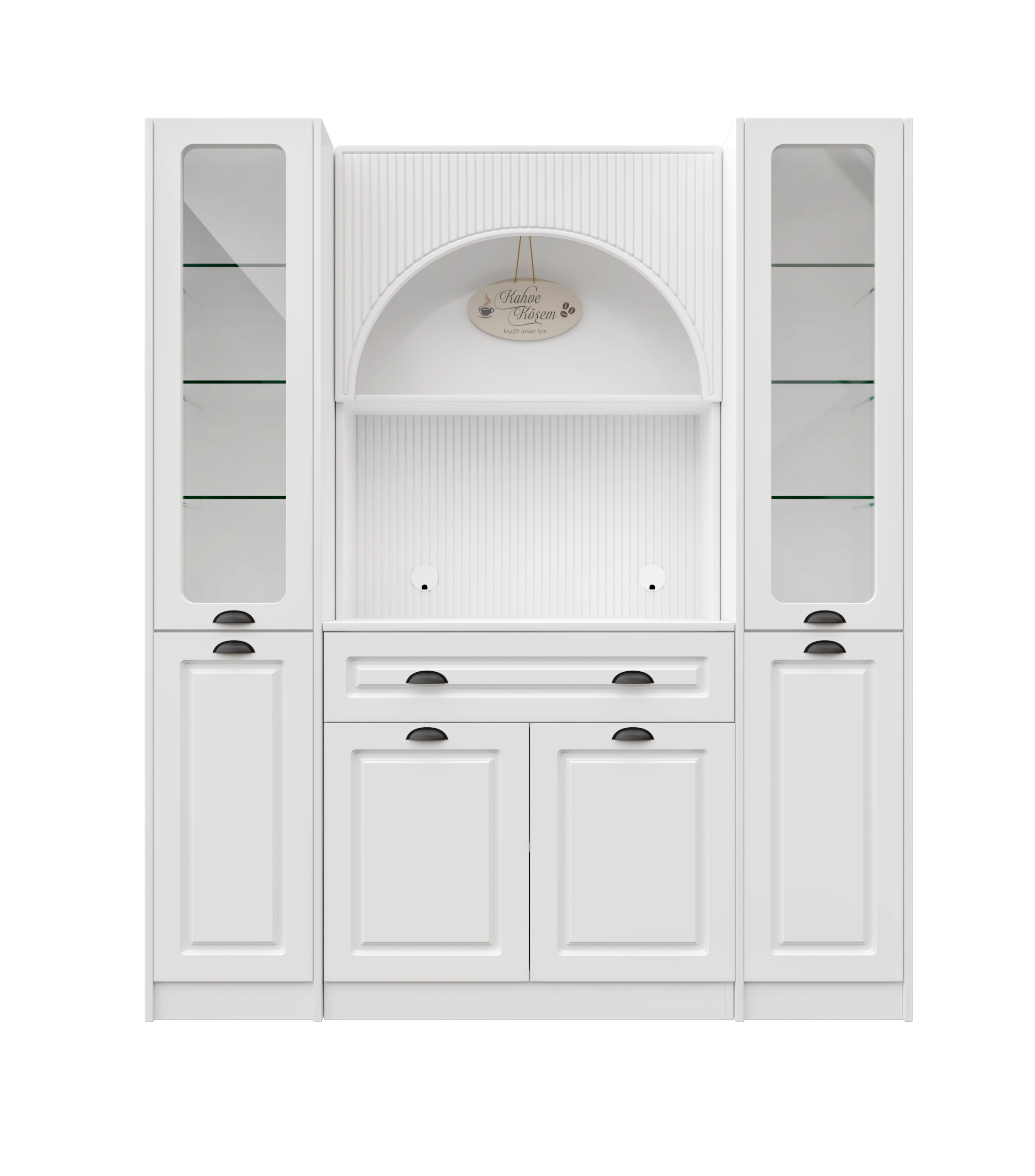 Sağ ve sol tarafta konumlandırılan camlı vitrin modülleri, raflı yapıları ve iç aydınlatmaları sayesinde fincan, bardak ve dekoratif ürünlerin şık bir şekilde sergilenmesine olanak tanır. Komple MDF gövde yapısı dayanıklılık sağlarken, siyah metal kulp detayları ürüne modern ve dengeli bir görünüm kazandırır.