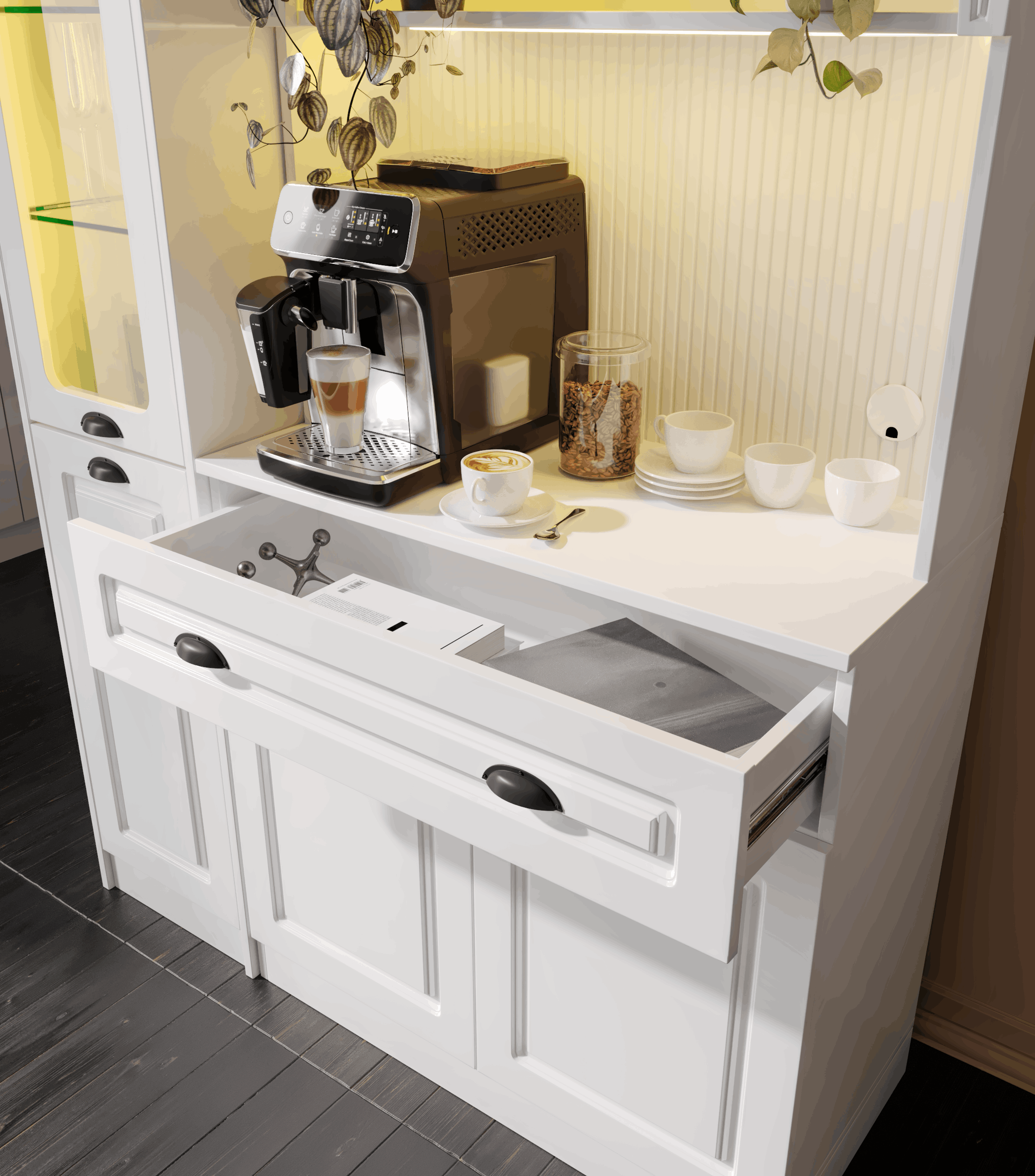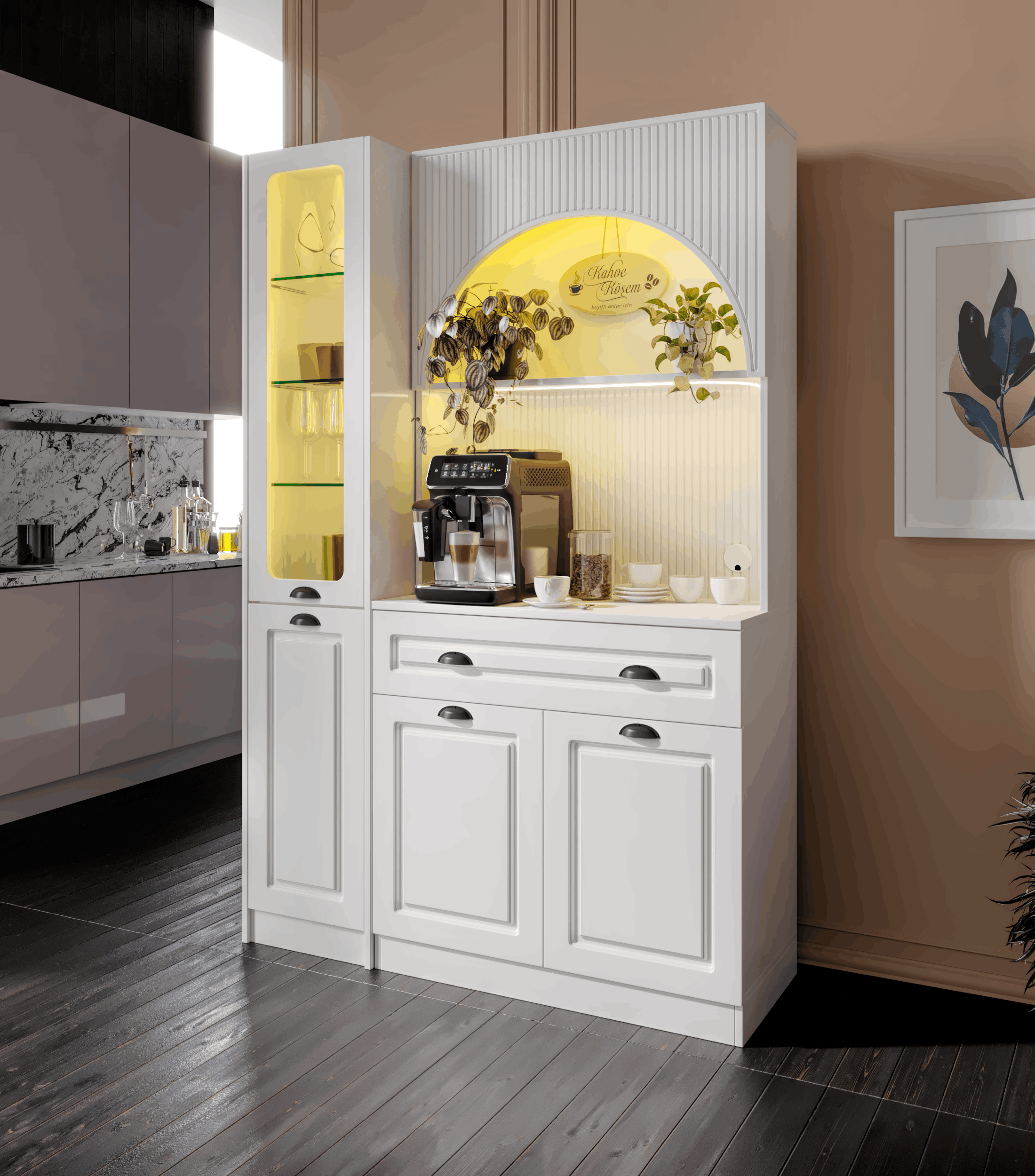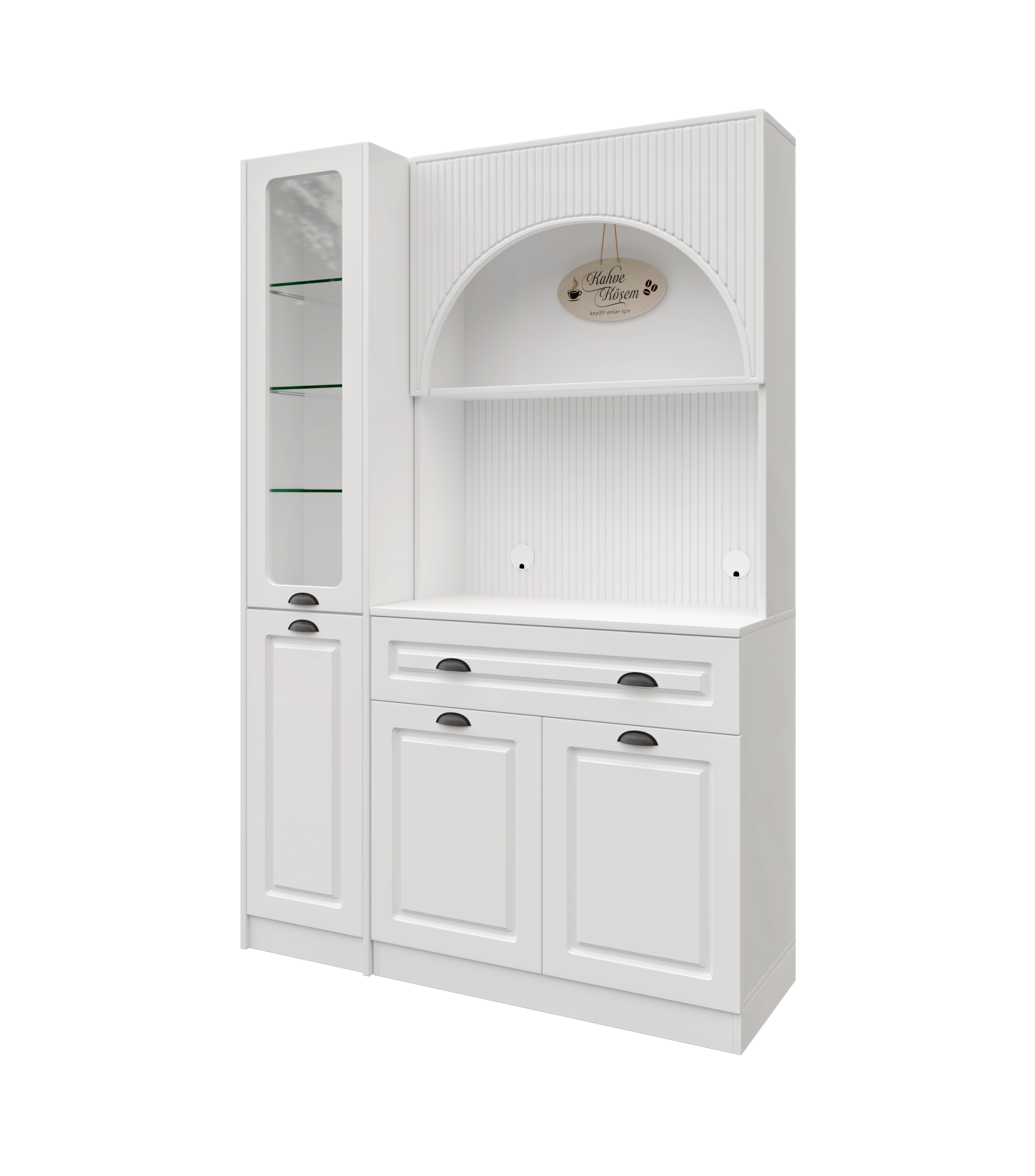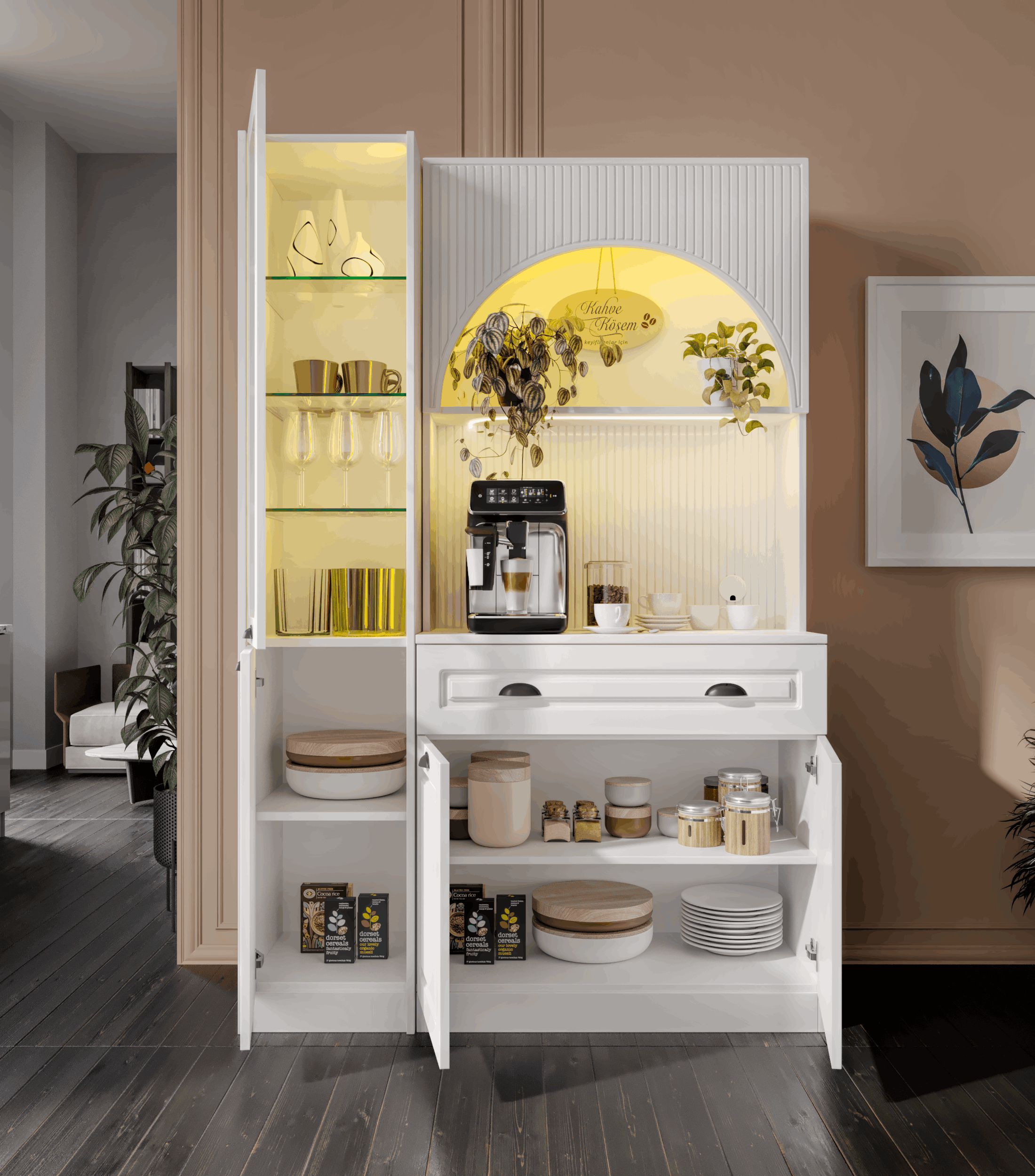 Kemer formuna sahip üst modül ve açık niş tasarımı, kahve makinesi ve günlük kullanım ürünleri için konforlu bir hazırlık alanı oluşturur. Alt modülde yer alan kapaklı dolap alanı; fincan, kahve ekipmanları ve aksesuarlar için düzenli ve gizli saklama imkânı sunar.