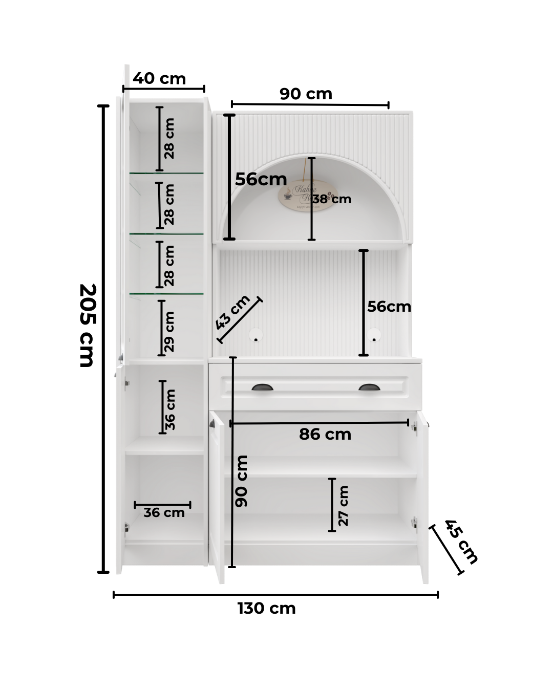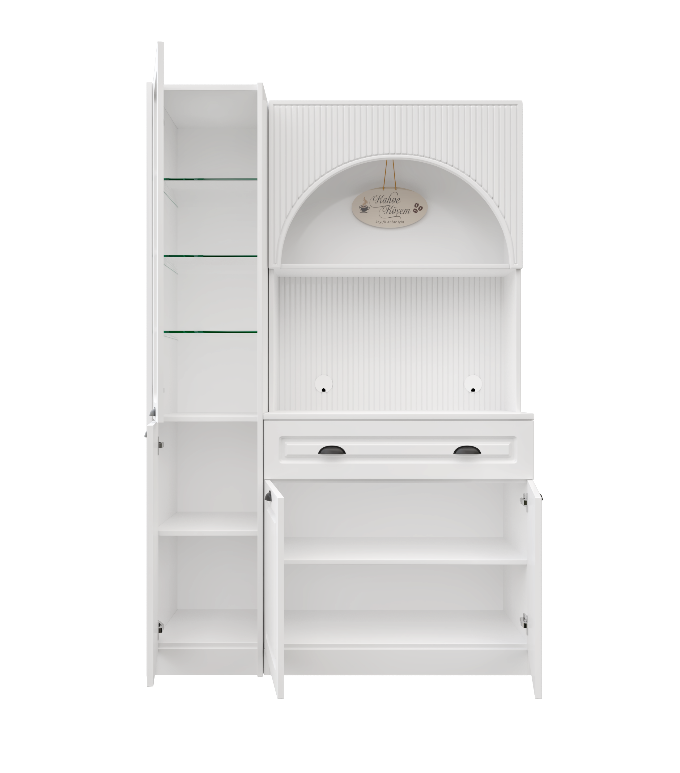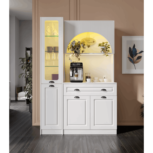 Sol tarafta konumlandırılan camlı vitrin modülü, raflı yapısı ve iç aydınlatması sayesinde fincan, bardak ve dekoratif ürünlerin şık bir şekilde sergilenmesine olanak tanır. Komple MDF gövde yapısı dayanıklılık sağlarken, siyah metal kulp detayları ürüne modern ve dengeli bir görünüm kazandırır.