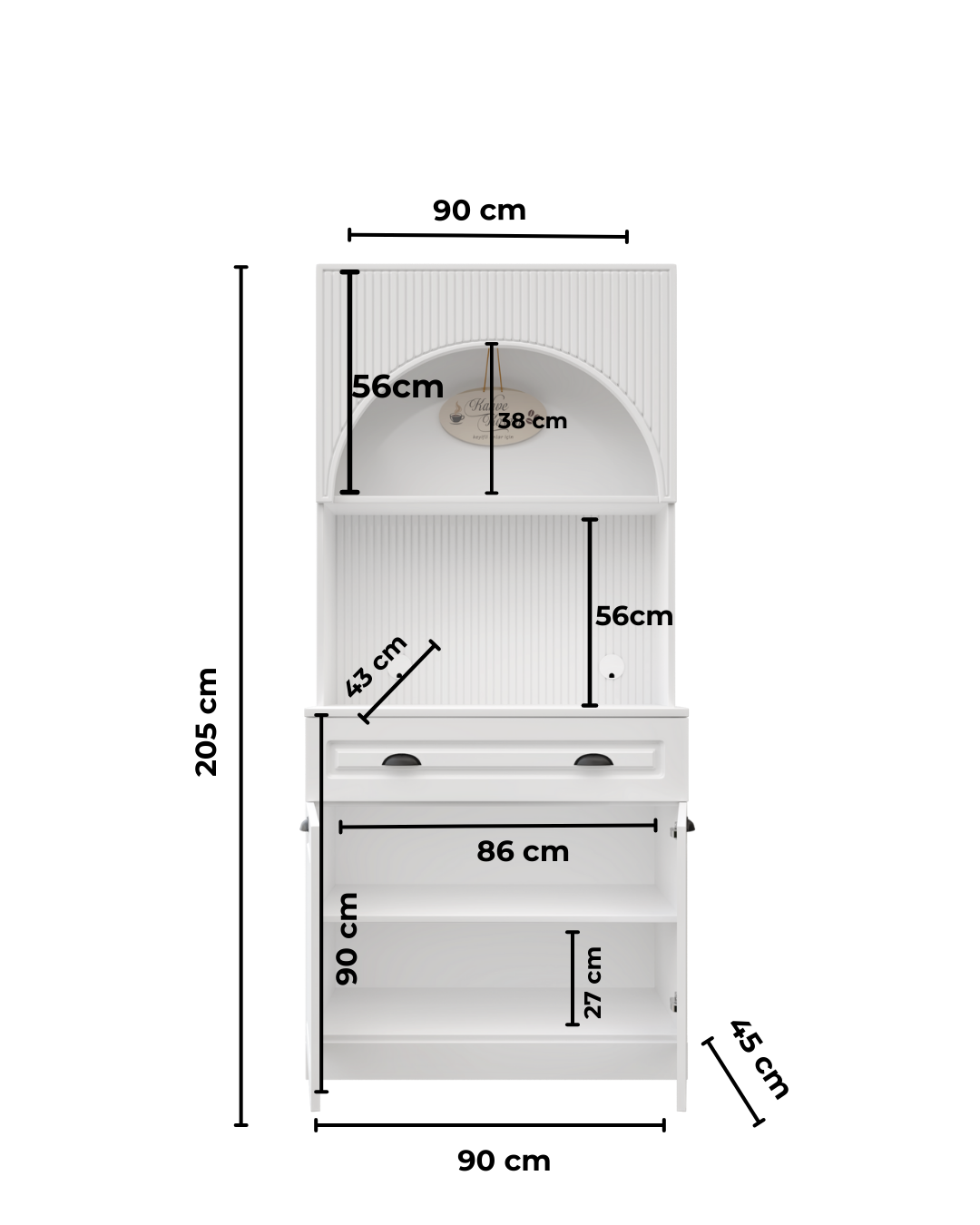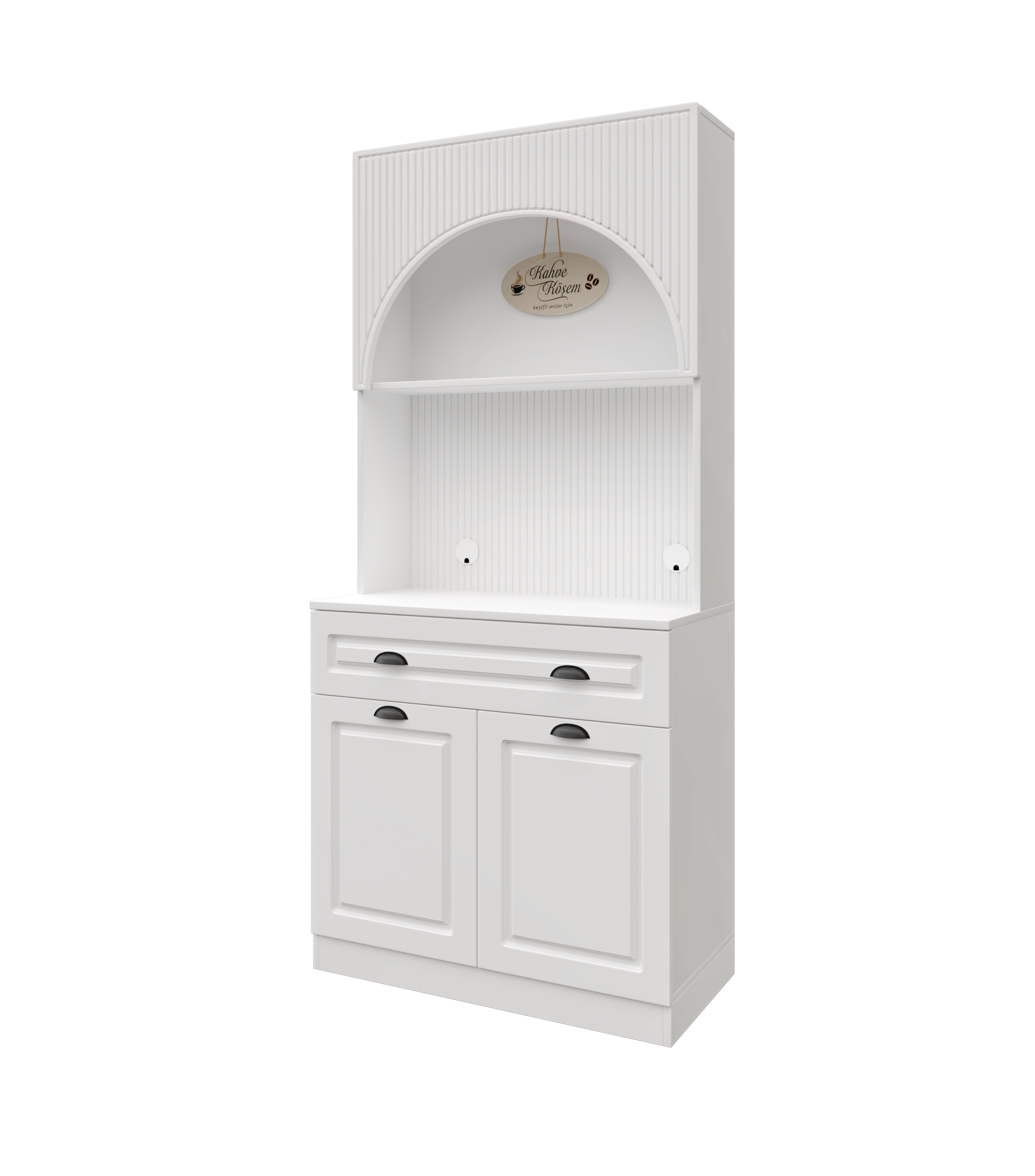Kemer formuna sahip üst modül ve açık niş tasarımı, kahve makinesi ve günlük kullanım ürünleri için konforlu bir hazırlık alanı sunar. Alt modülde yer alan kapaklı dolap alanı ise fincan, kahve ekipmanları ve aksesuarlar için düzenli bir saklama imkânı sağlar.