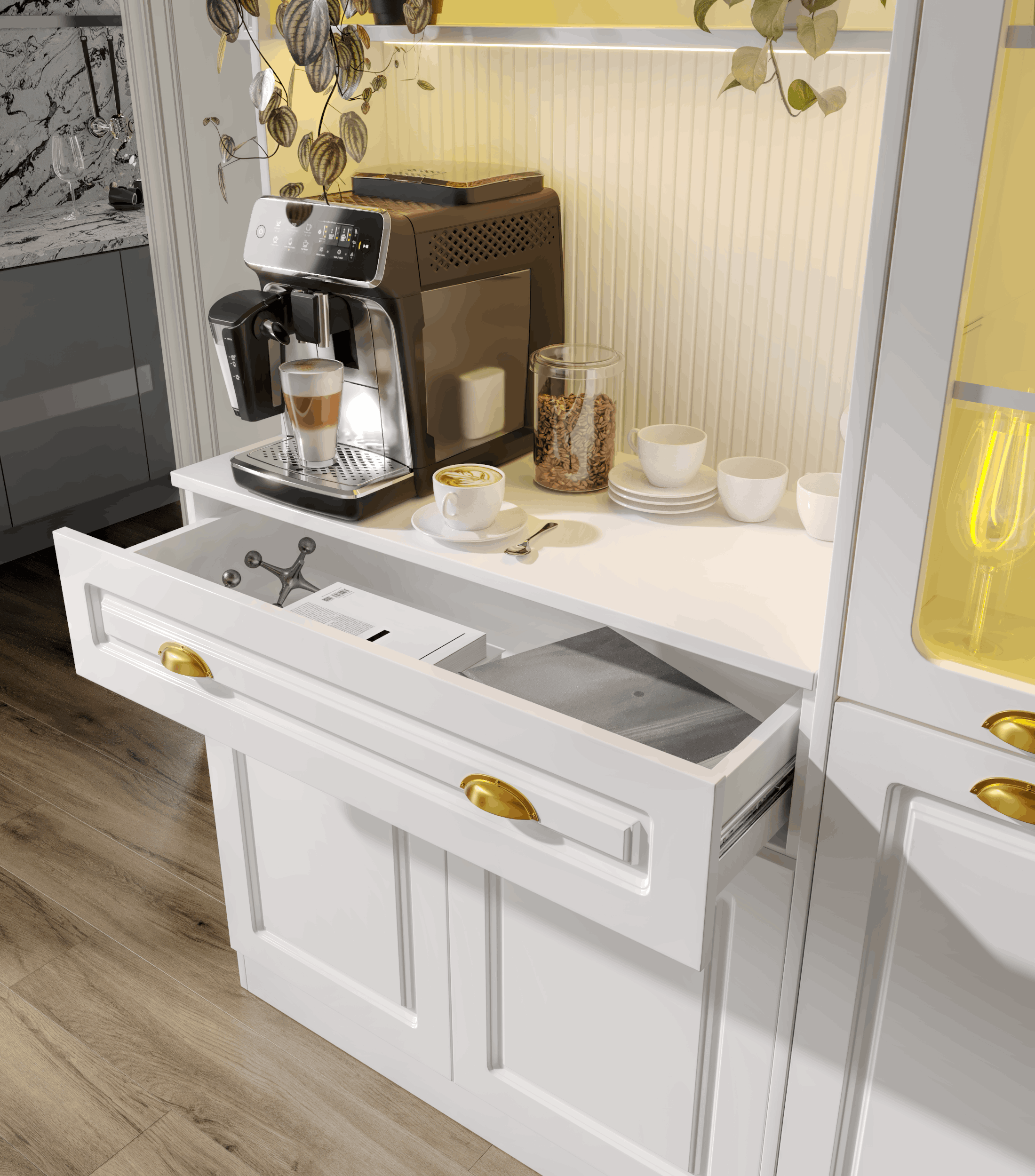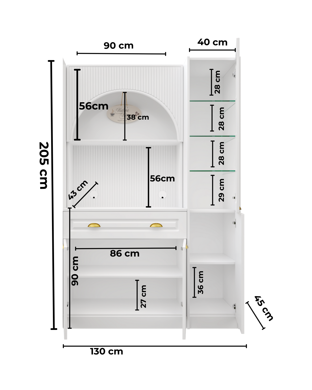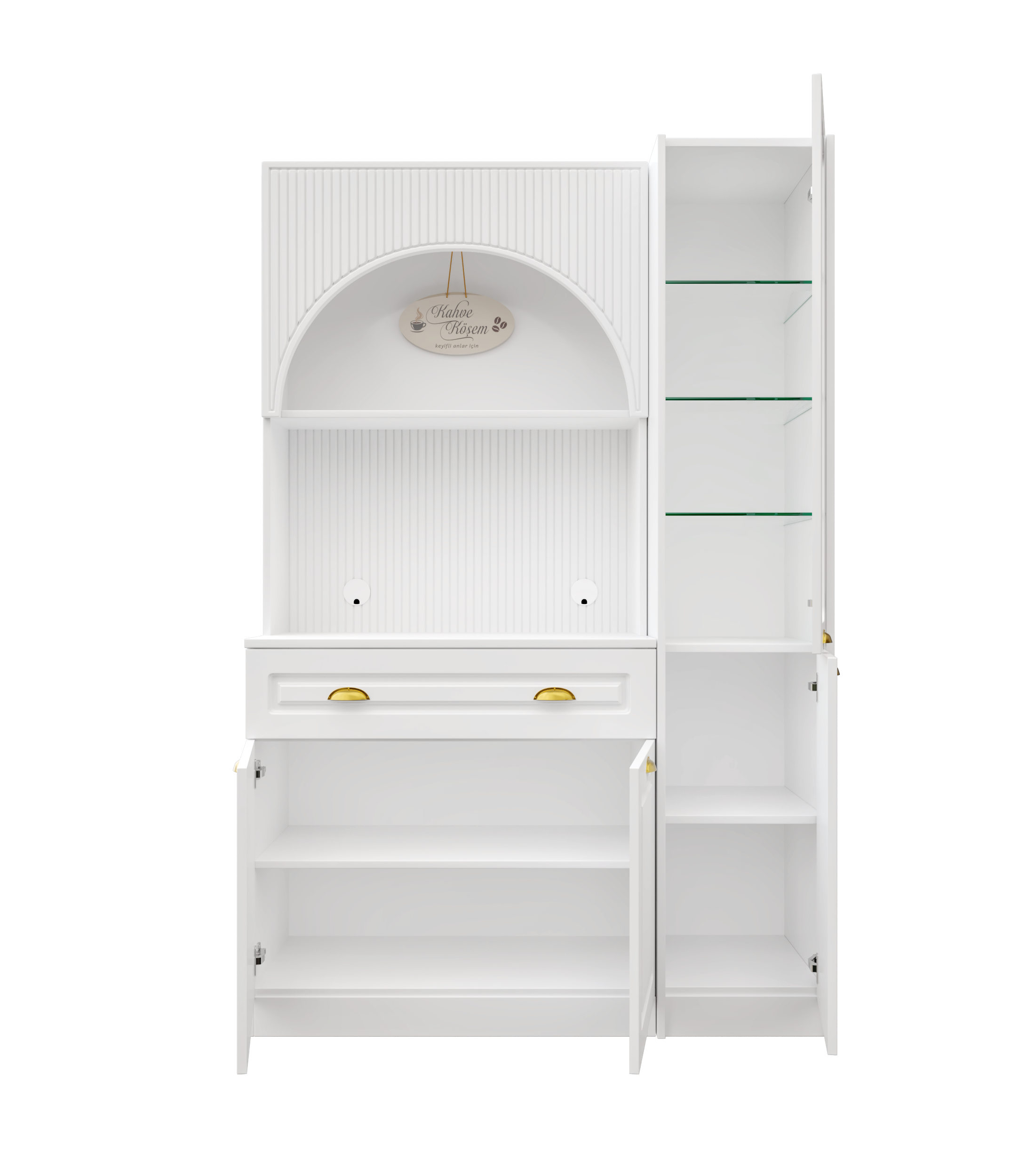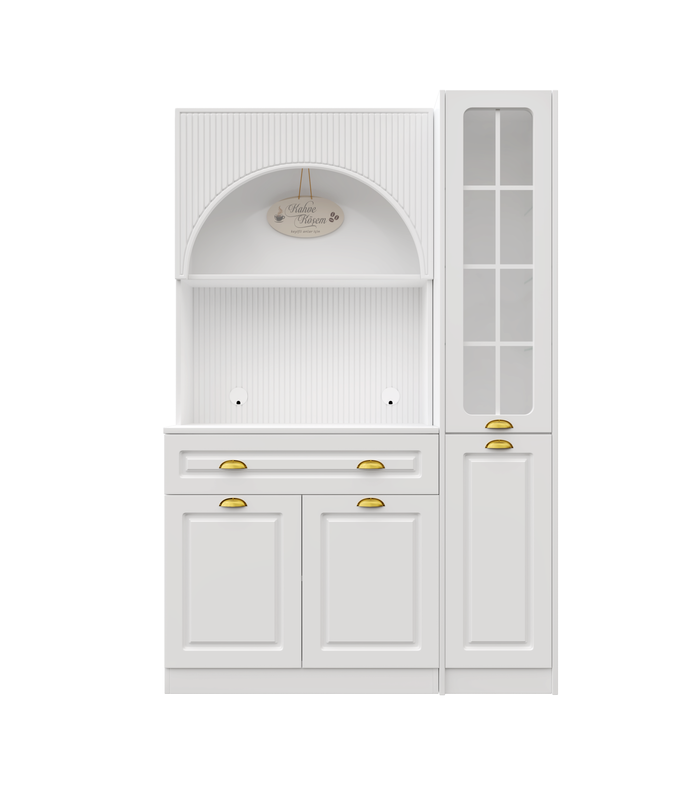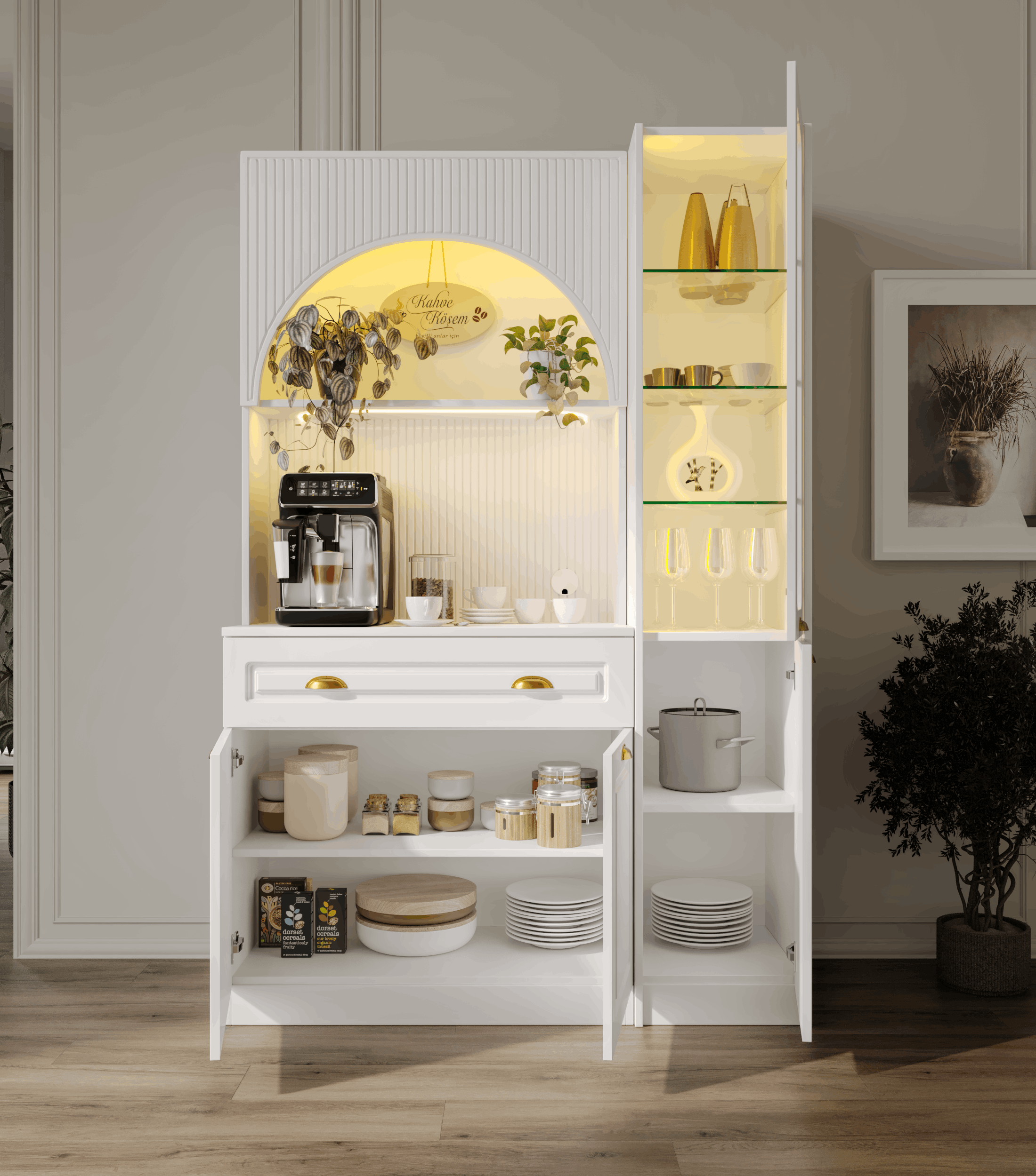 Kemer formuna sahip üst modül ve entegre aydınlatmalı açık niş alanı, kahve makinesi ve günlük kullanım ürünleri için konforlu bir hazırlık alanı oluşturur. Alt modülde yer alan kapaklı dolap bölümü ise fincan, kahve ekipmanları ve aksesuarlar için düzenli saklama imkânı sağlar.