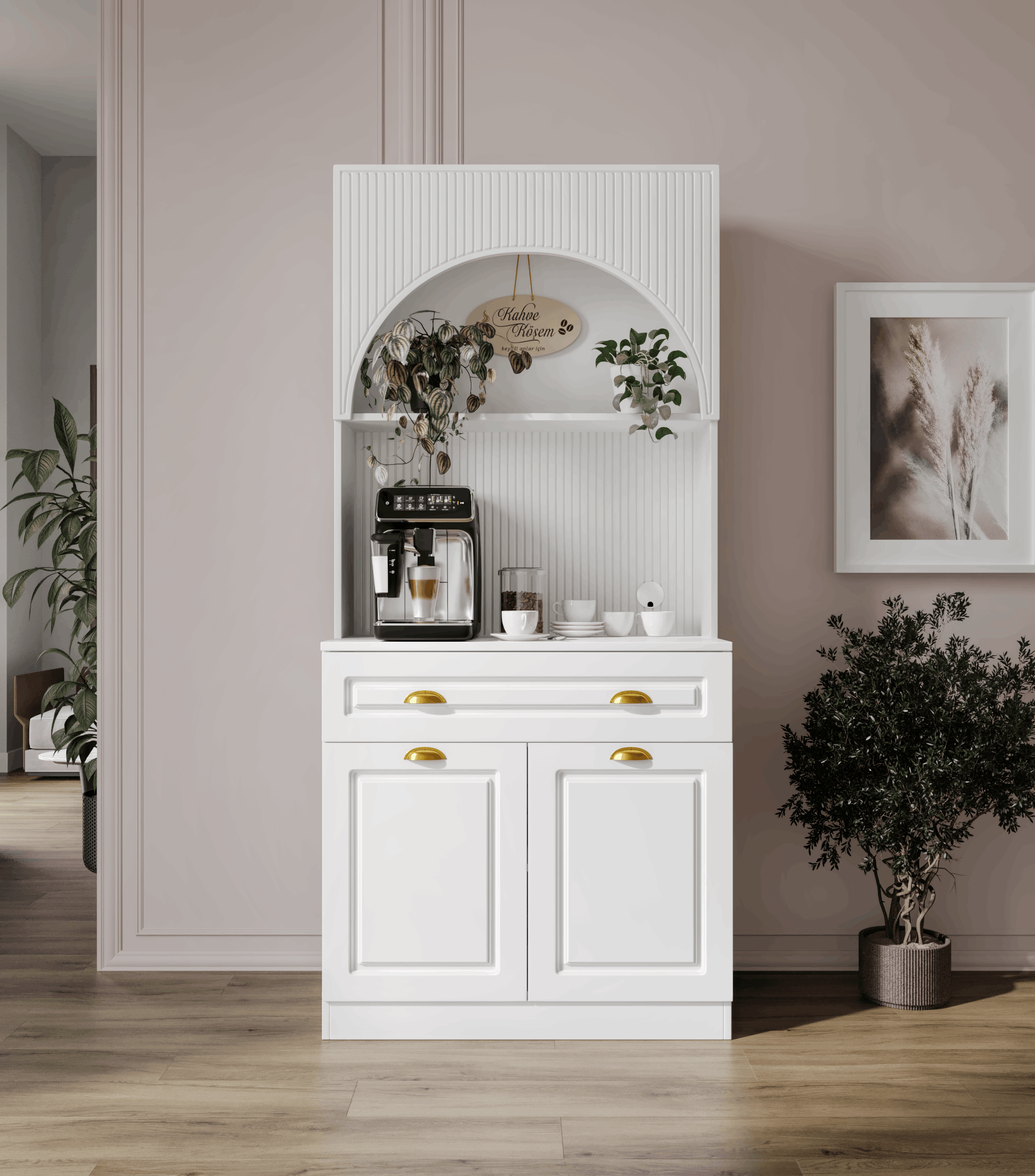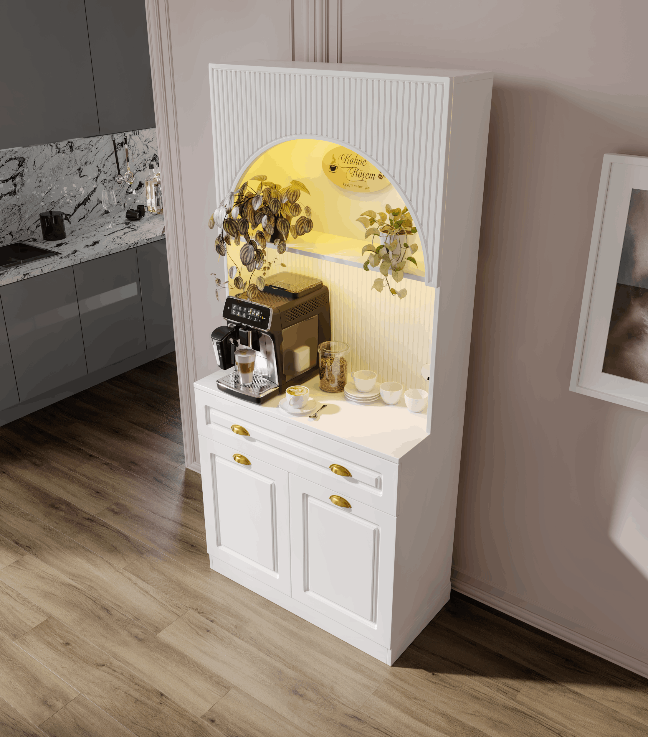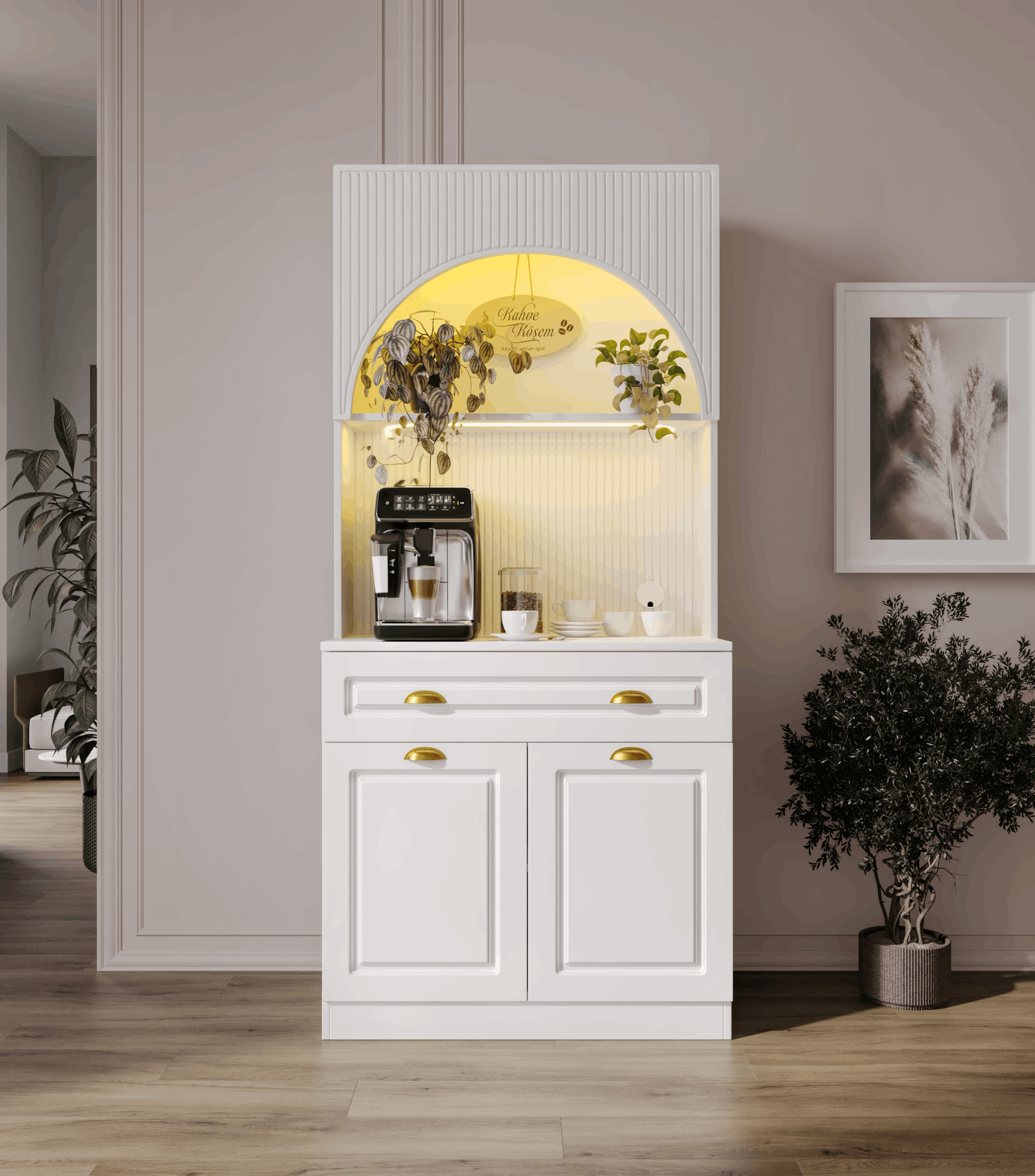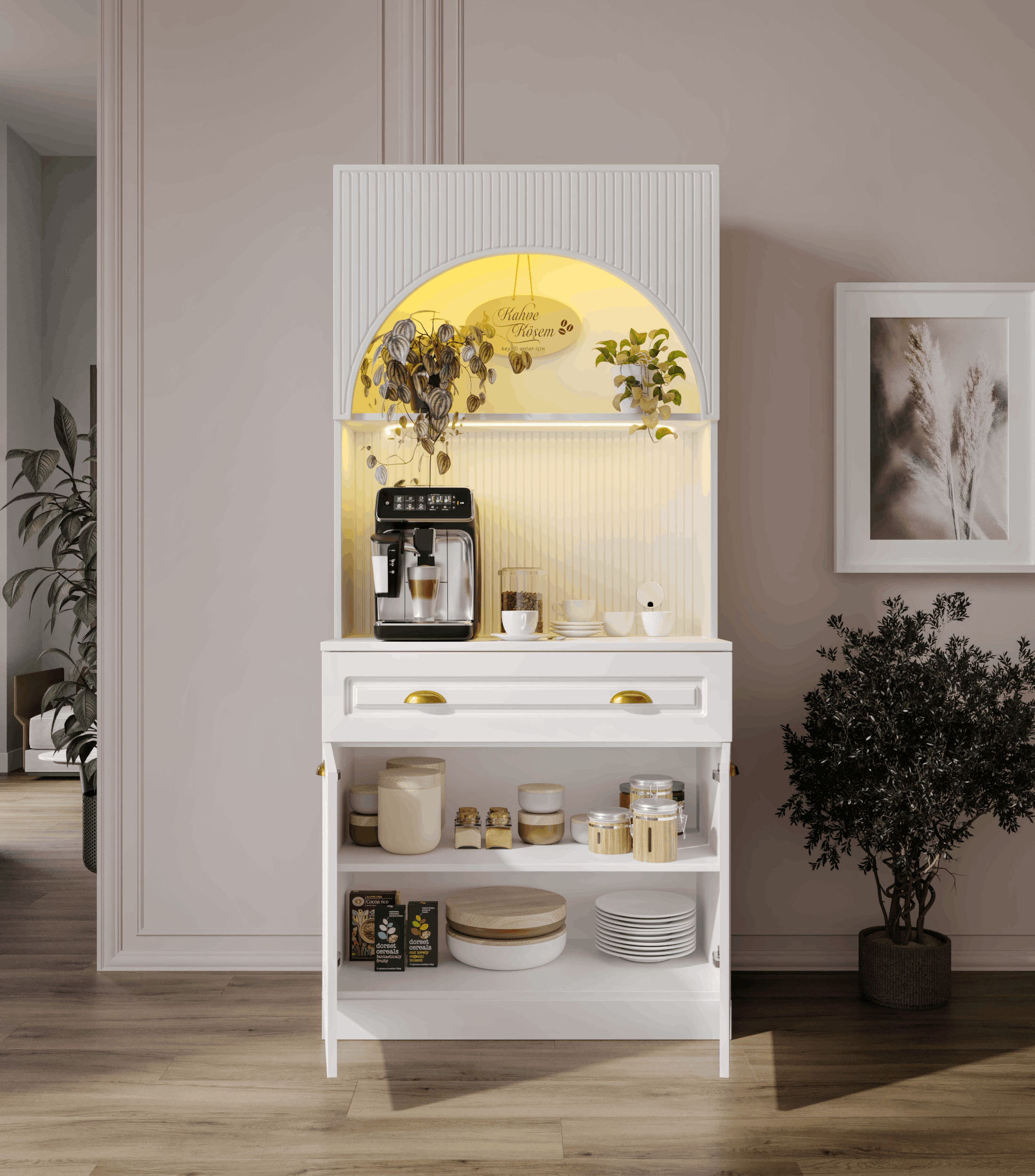 Üst modülde yer alan kemerli açık niş tasarımı ve entegre aydınlatma detayı, kahve makinesi ve dekoratif aksesuarlar için hem estetik hem de fonksiyonel bir kullanım sunar. Alt modülde bulunan kapaklı dolap alanı ise fincan, kahve ekipmanları ve aksesuarlar için düzenli bir saklama çözümü sağlar.
