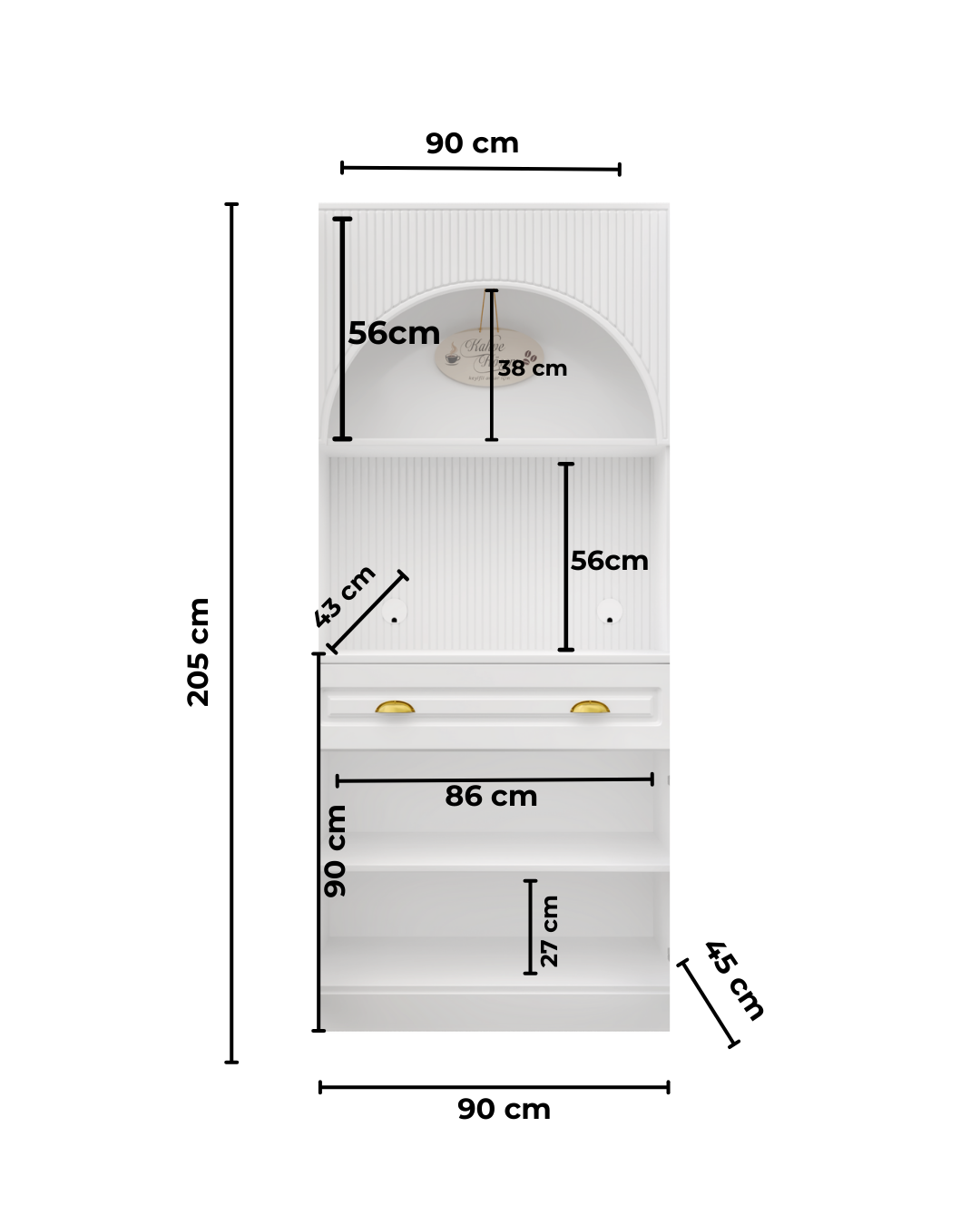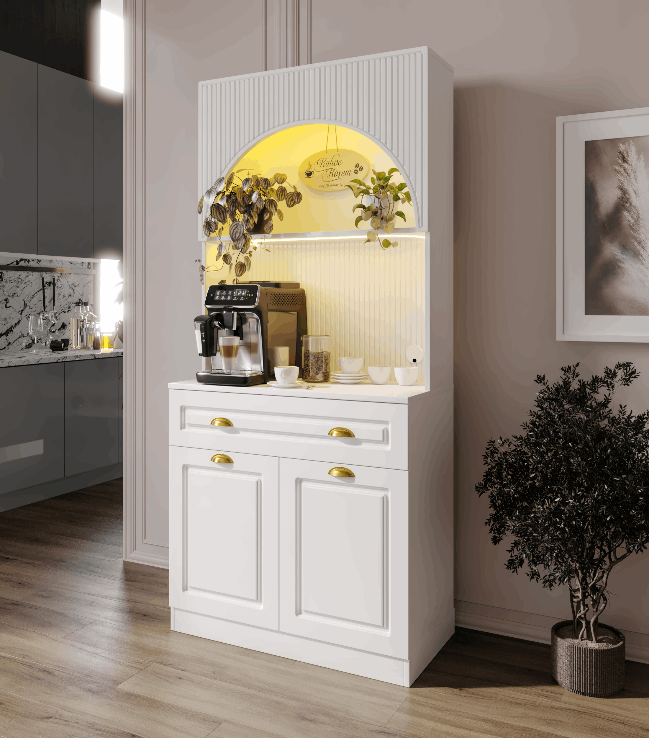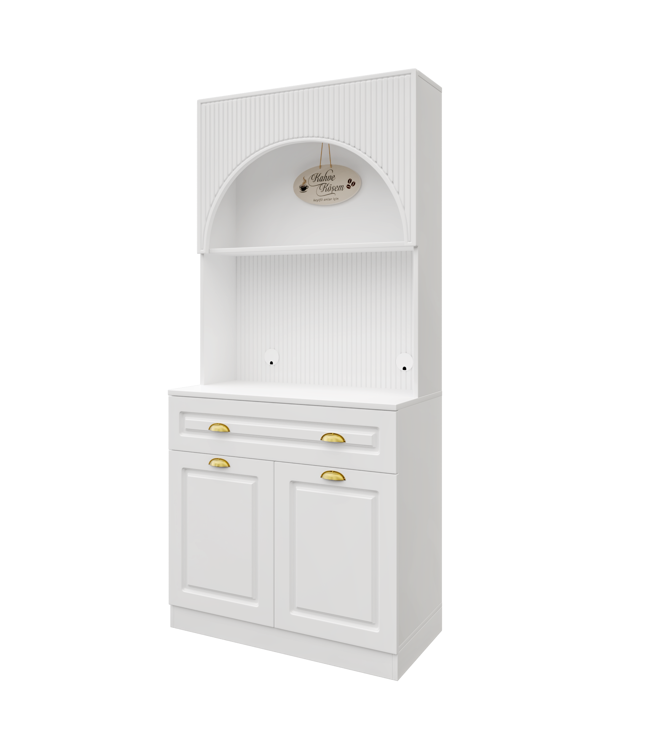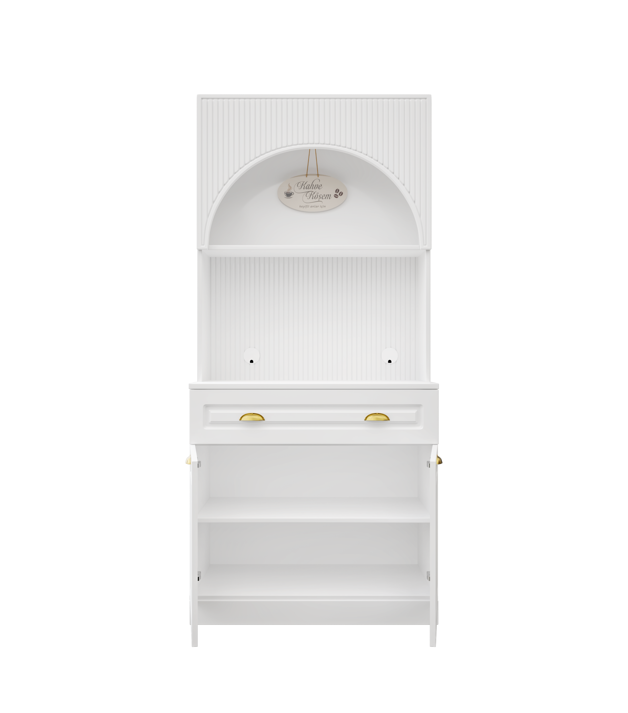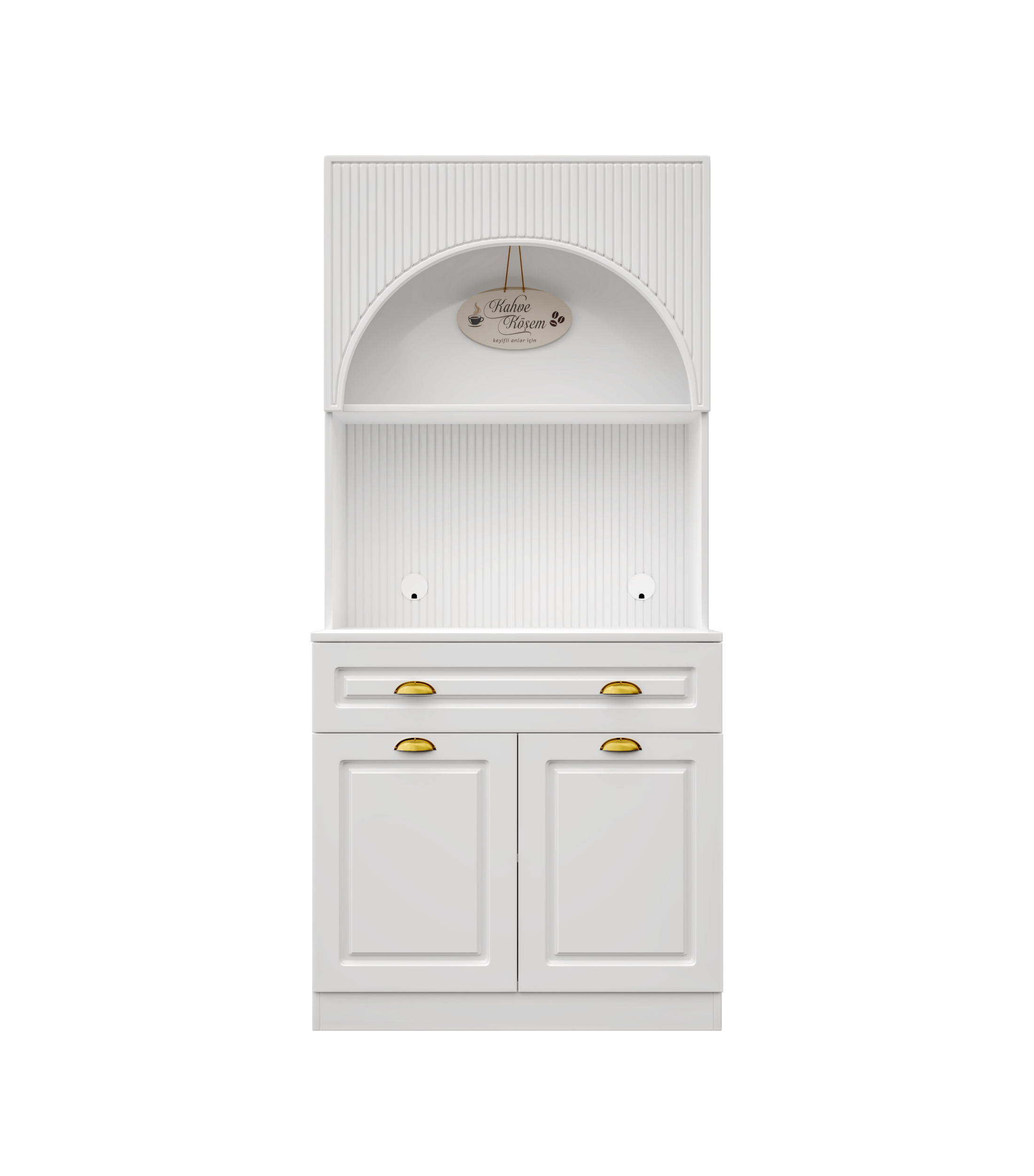 Üst modülde yer alan kemerli açık niş tasarımı ve entegre aydınlatma detayı, kahve makinesi ve dekoratif aksesuarlar için hem estetik hem de fonksiyonel bir kullanım sunar. Alt modülde bulunan kapaklı dolap alanı ise fincan, kahve ekipmanları ve aksesuarlar için düzenli bir saklama çözümü sağlar.