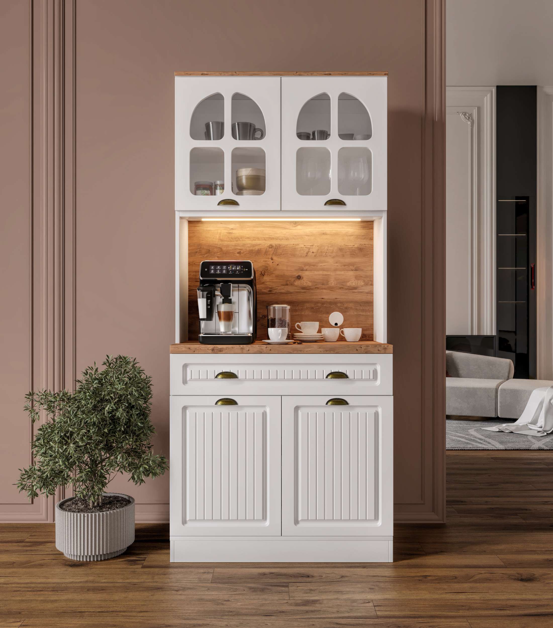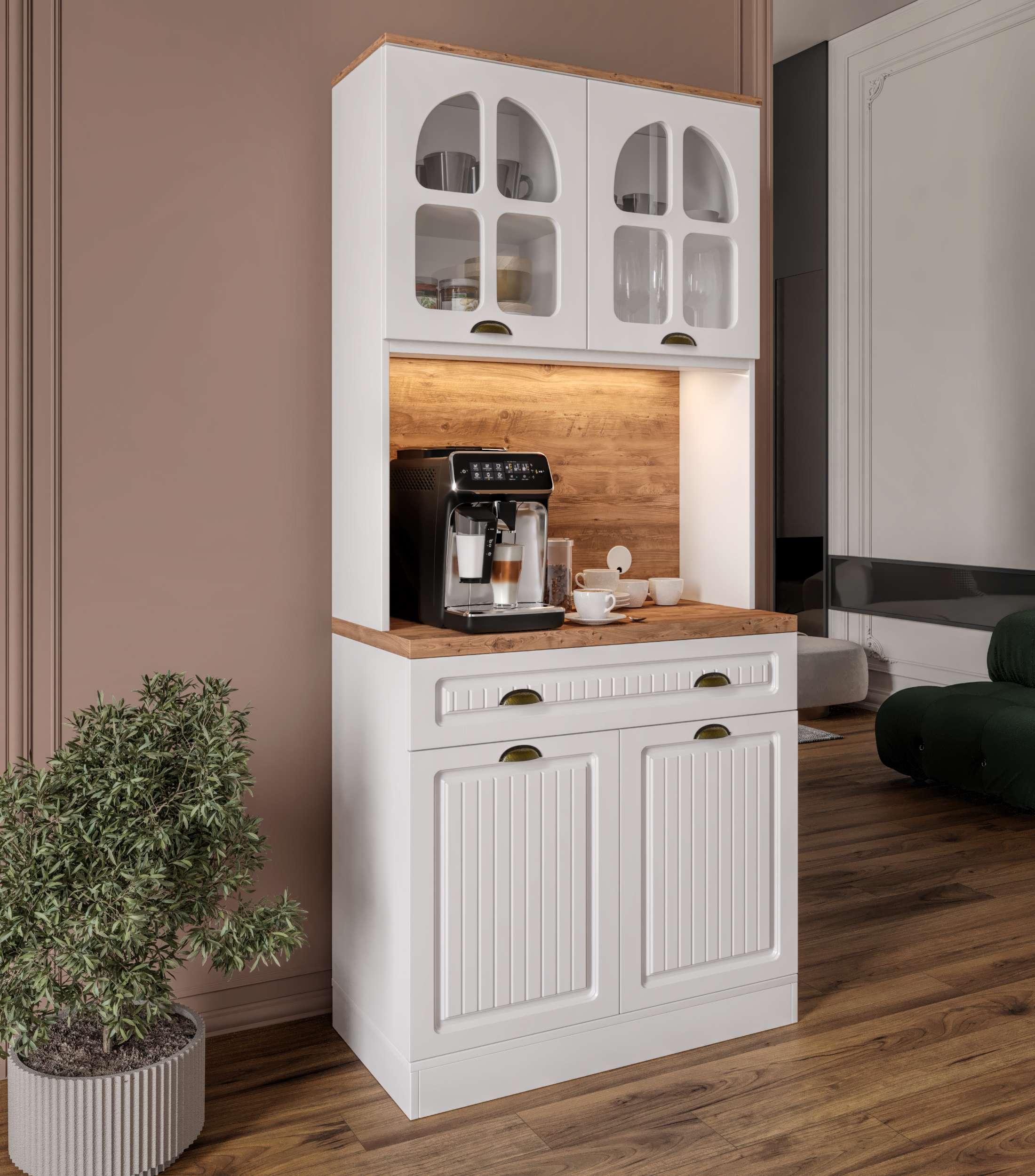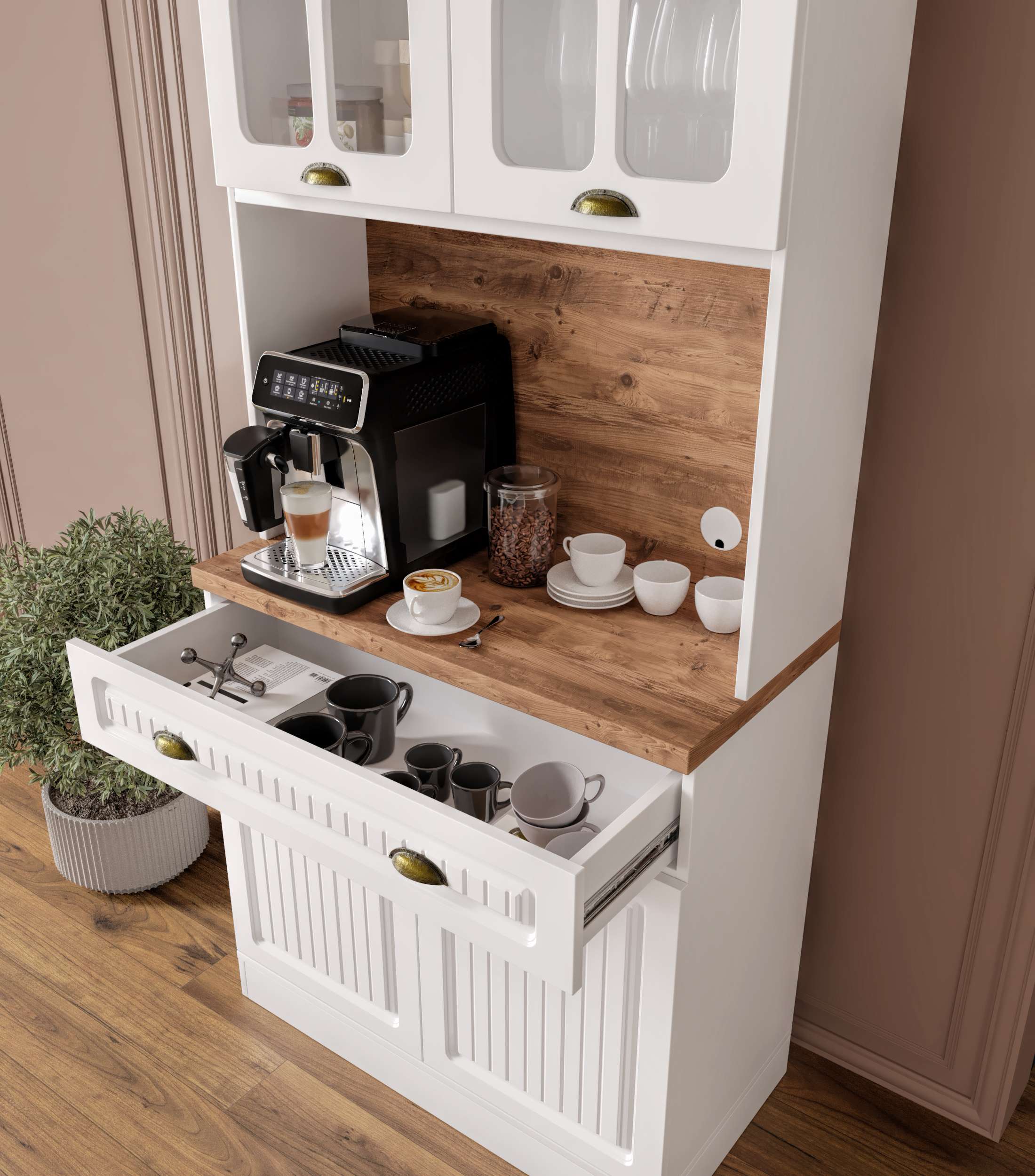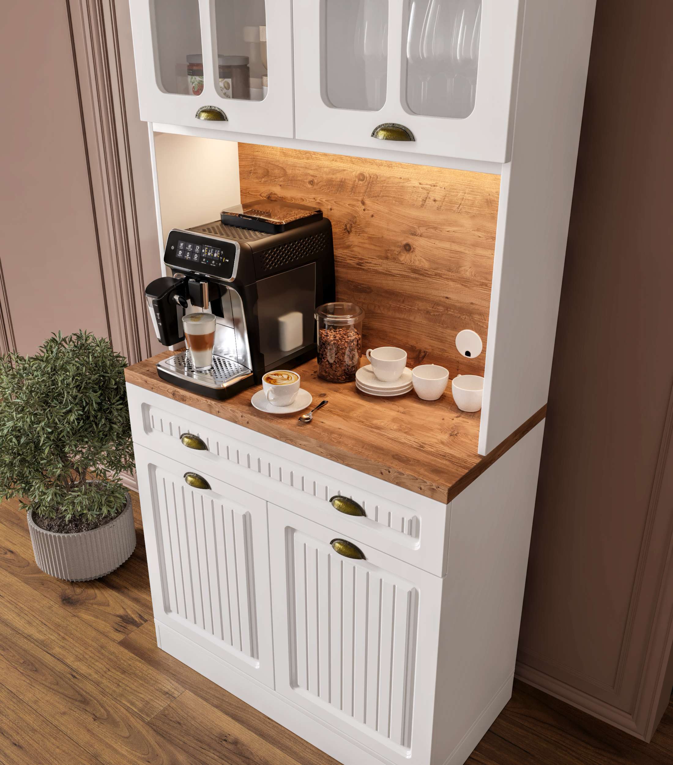 Efes 93 cm Kahve Köşesi, küçük mutfaklar ve dar alanlar için tasarlanmış şık, kompakt ve işlevsel bir mutfak dolabıdır. Tamamen MDF gövde yapısı, membran kapakları ve yavaş kapanma özellikli pistonlu menteşeleriyle hem estetik hem de dayanıklılık sunar. Modern tasarımı sayesinde kahve makinesi, airfryer veya mikrodalga gibi küçük ev aletlerini konumlandırmak için ideal bir tezgâh alanı sağlar.