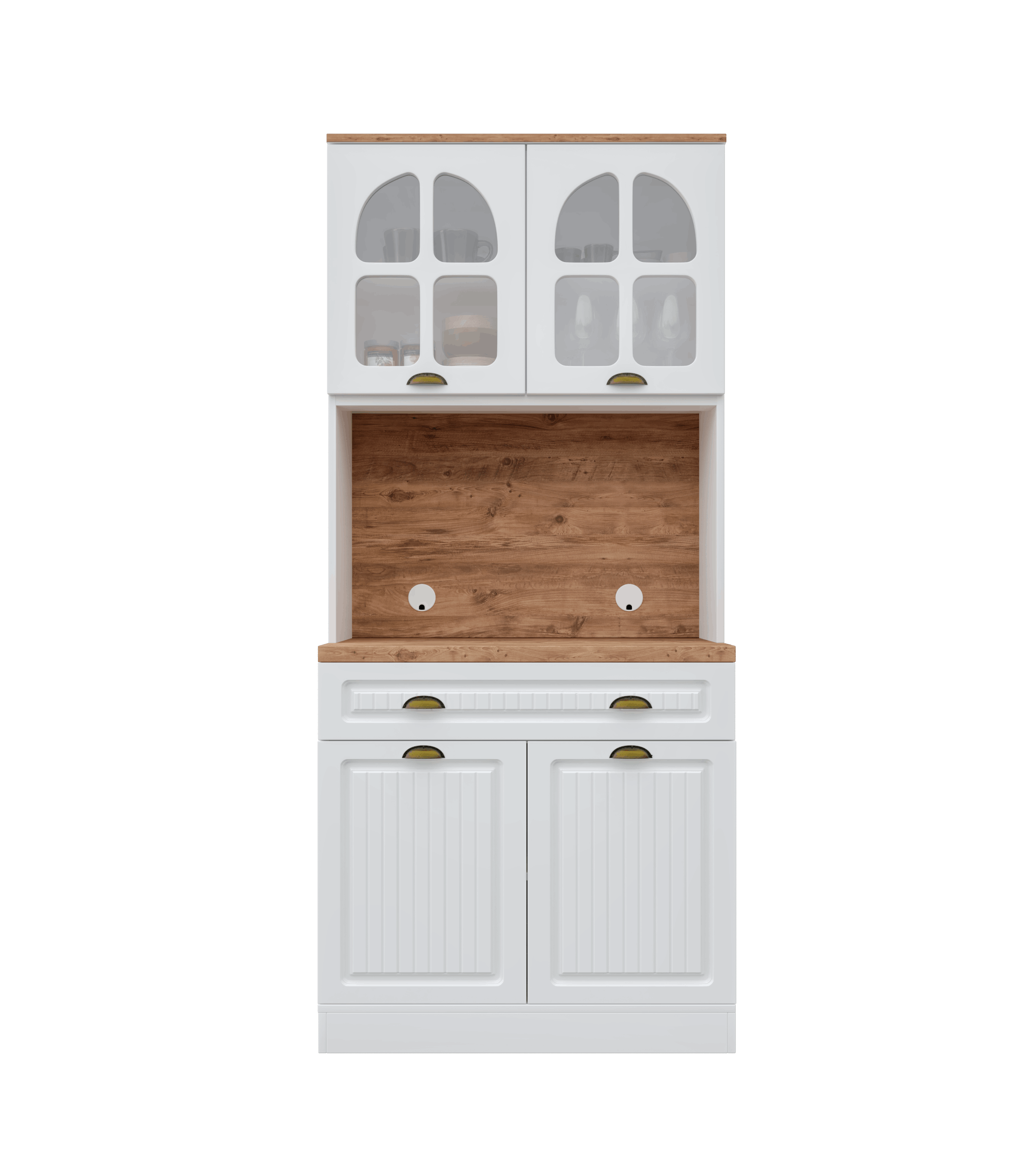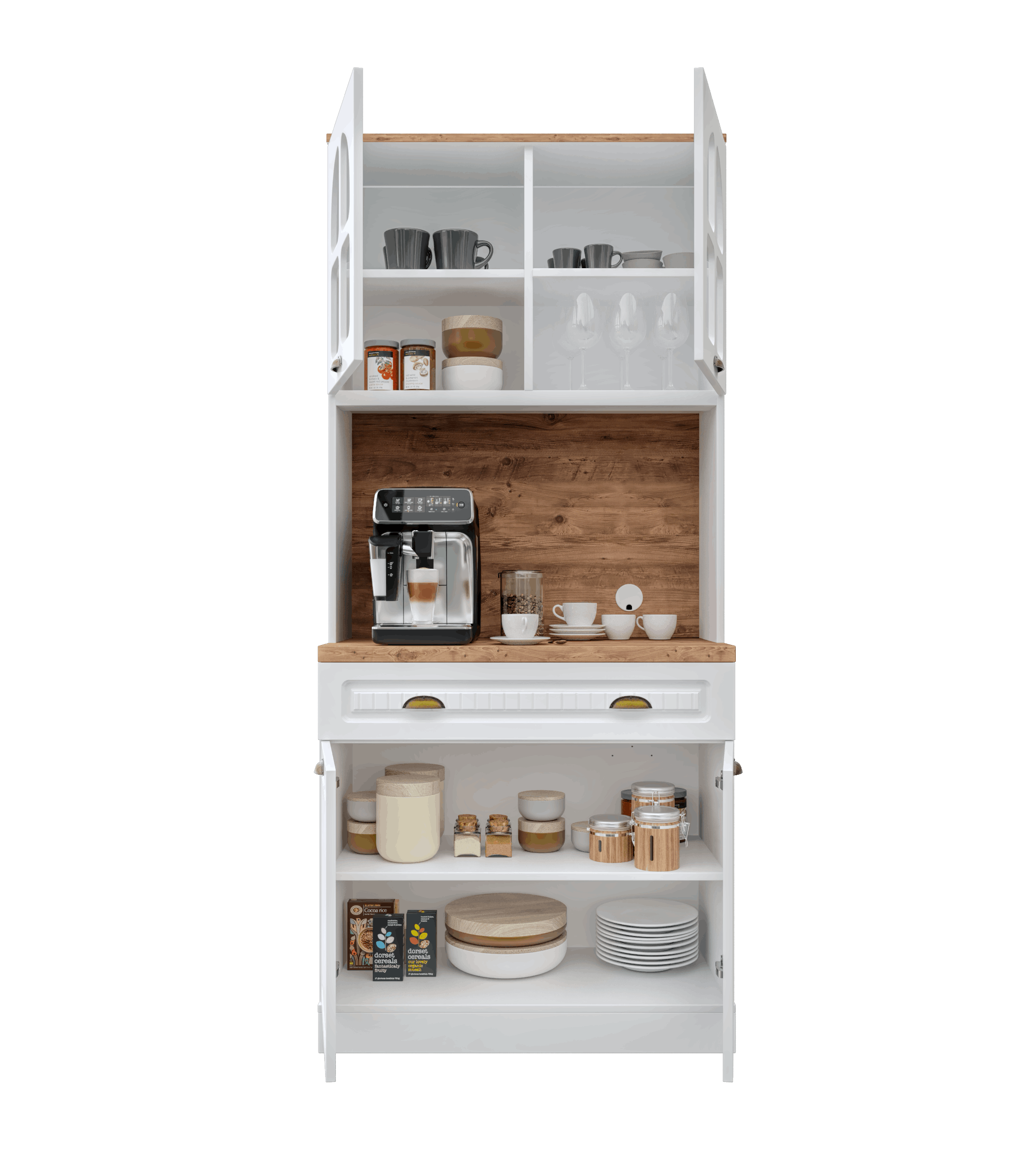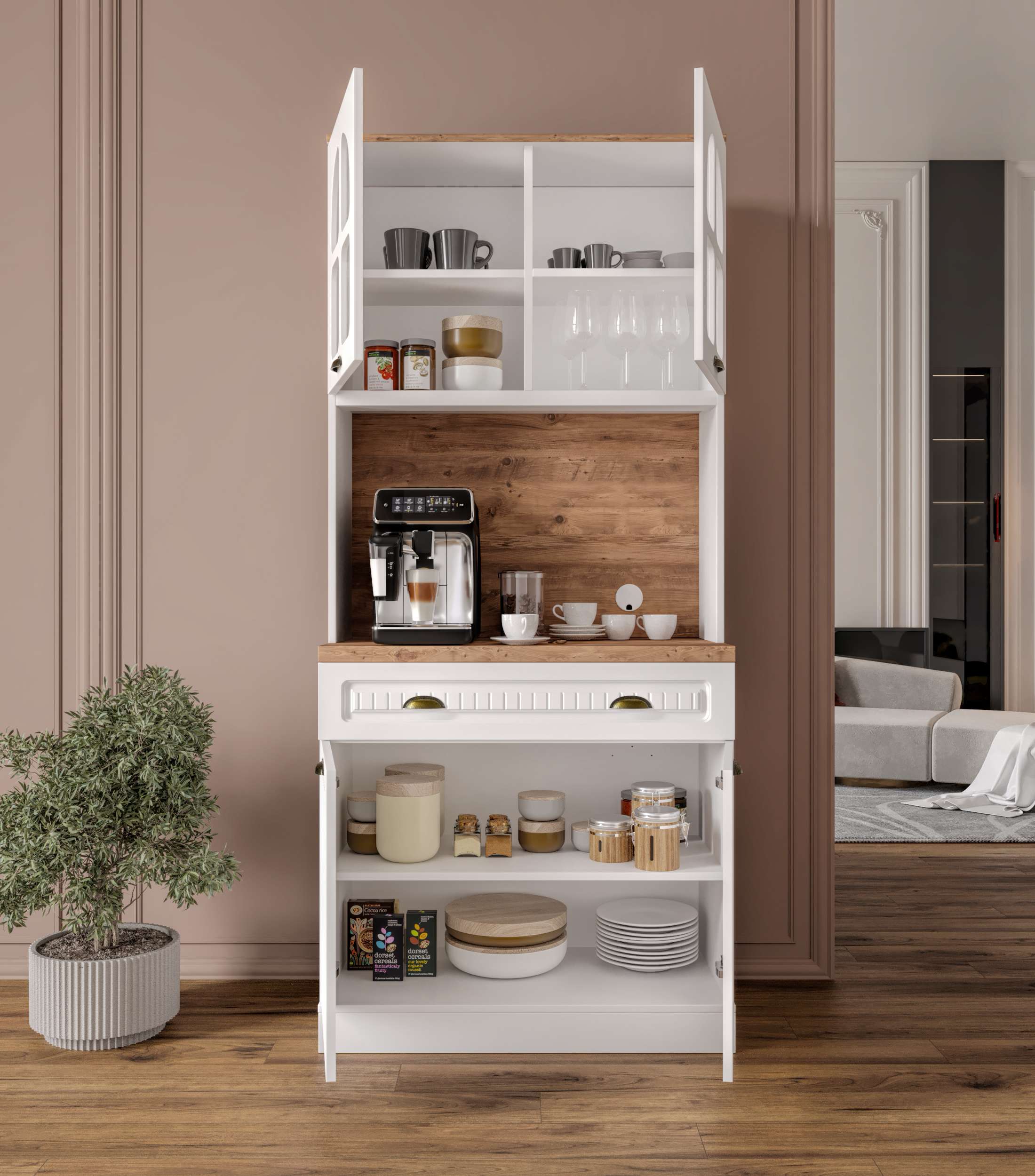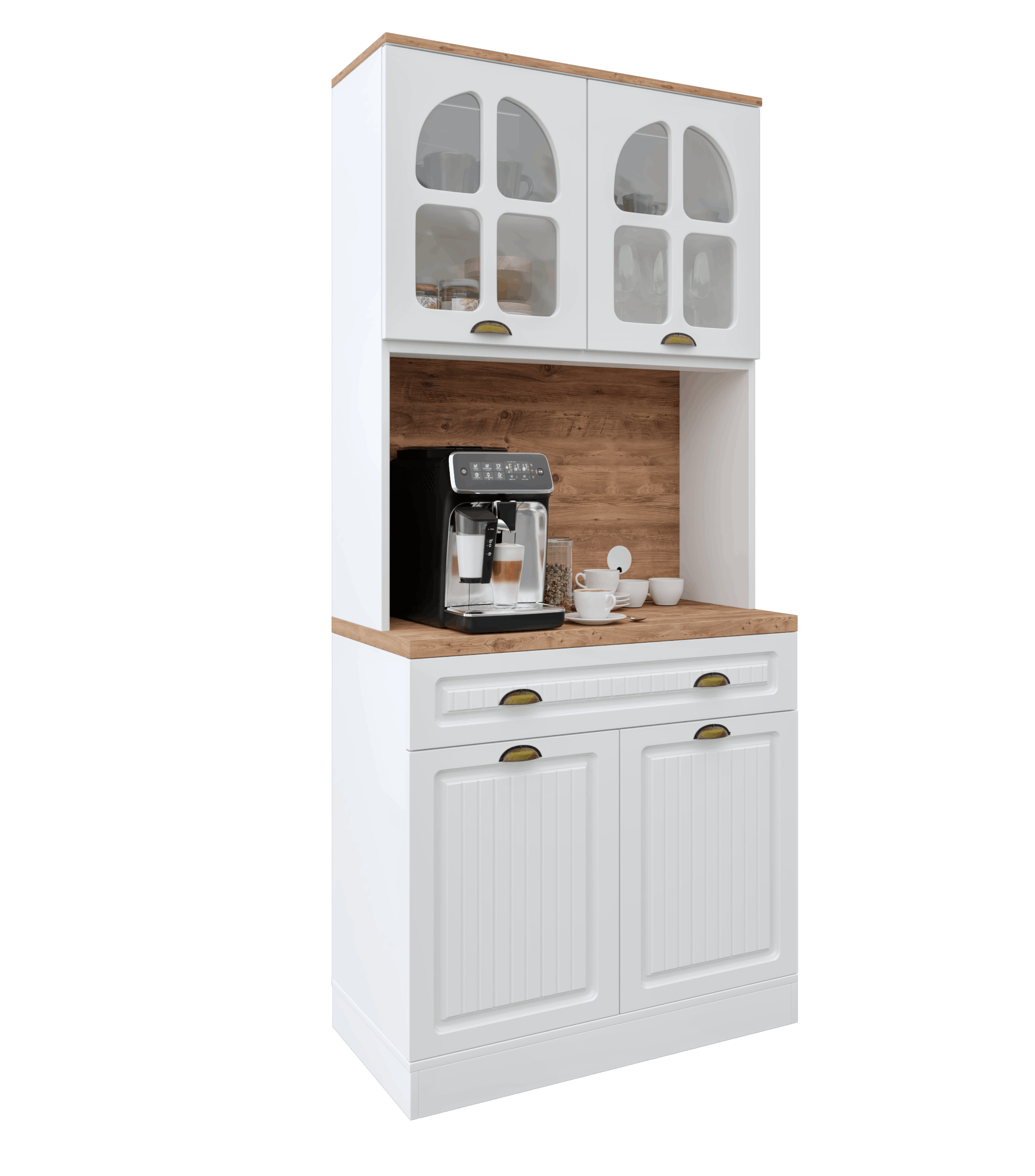 Üst modülde yer alan kapaklı dolap bölmeleri, fincan, kahve ve aksesuarlar için düzenli bir depolama alanı oluşturur. Alt modül ise geniş raf yapısı sayesinde mutfak malzemeleri veya saklama kutuları için yeterli hacmi sunar. Efes 93 cm Kahve Köşesi, sade çizgileri ve kompakt ölçüleriyle her ortama uyum sağlayarak mutfağınıza hem fonksiyonellik hem de estetik kazandırır.