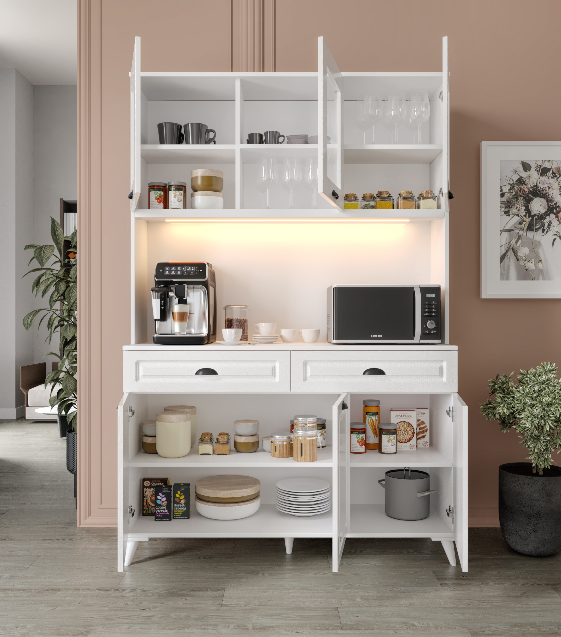 - Çok amaçlı kullanım: Kahve köşesi, airfryer dolabı, mutfak dolabı