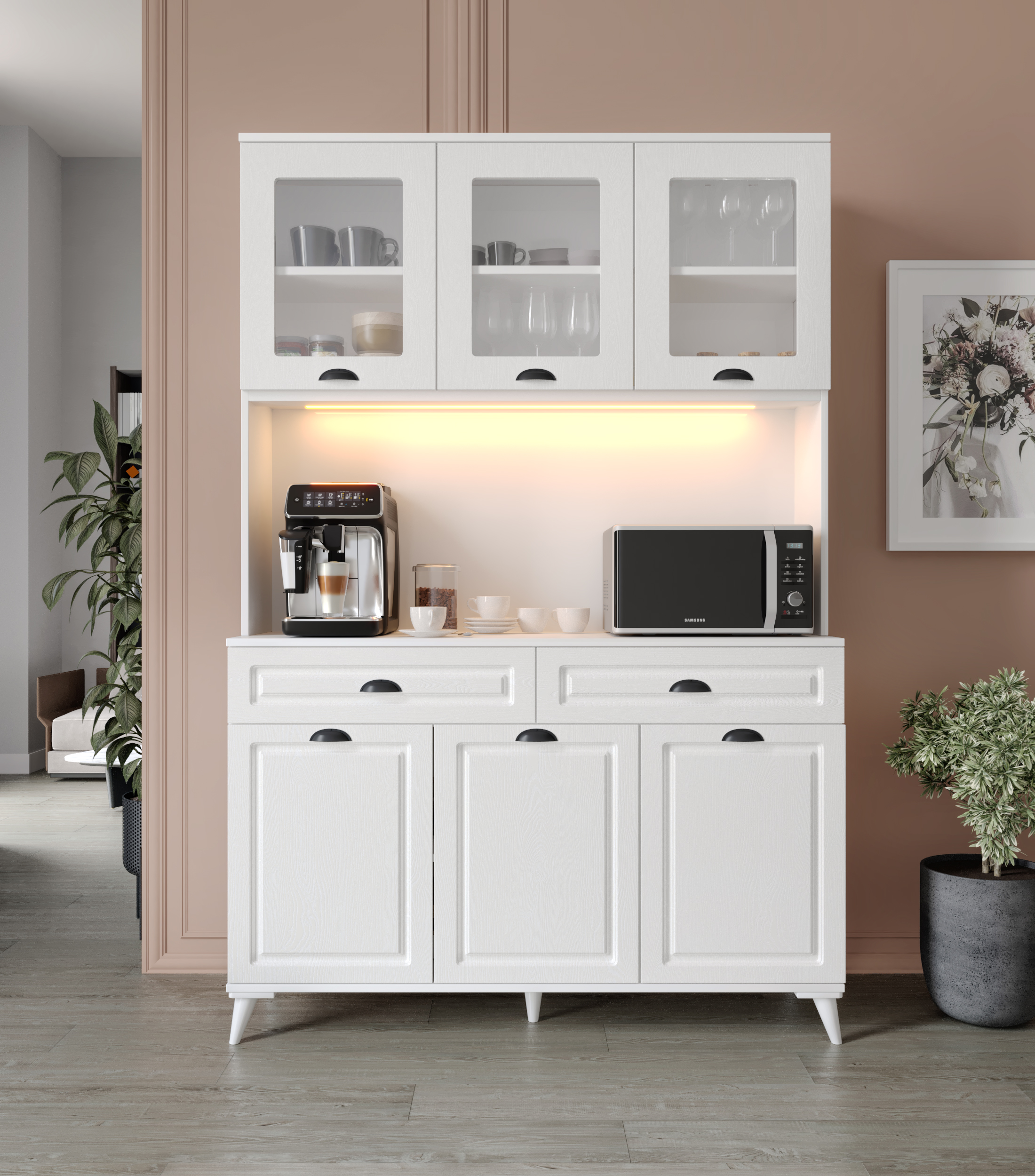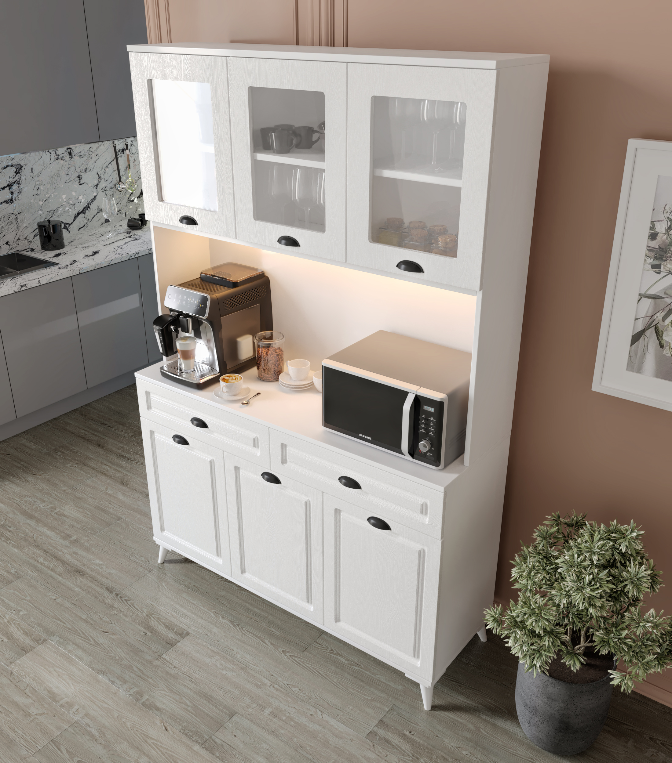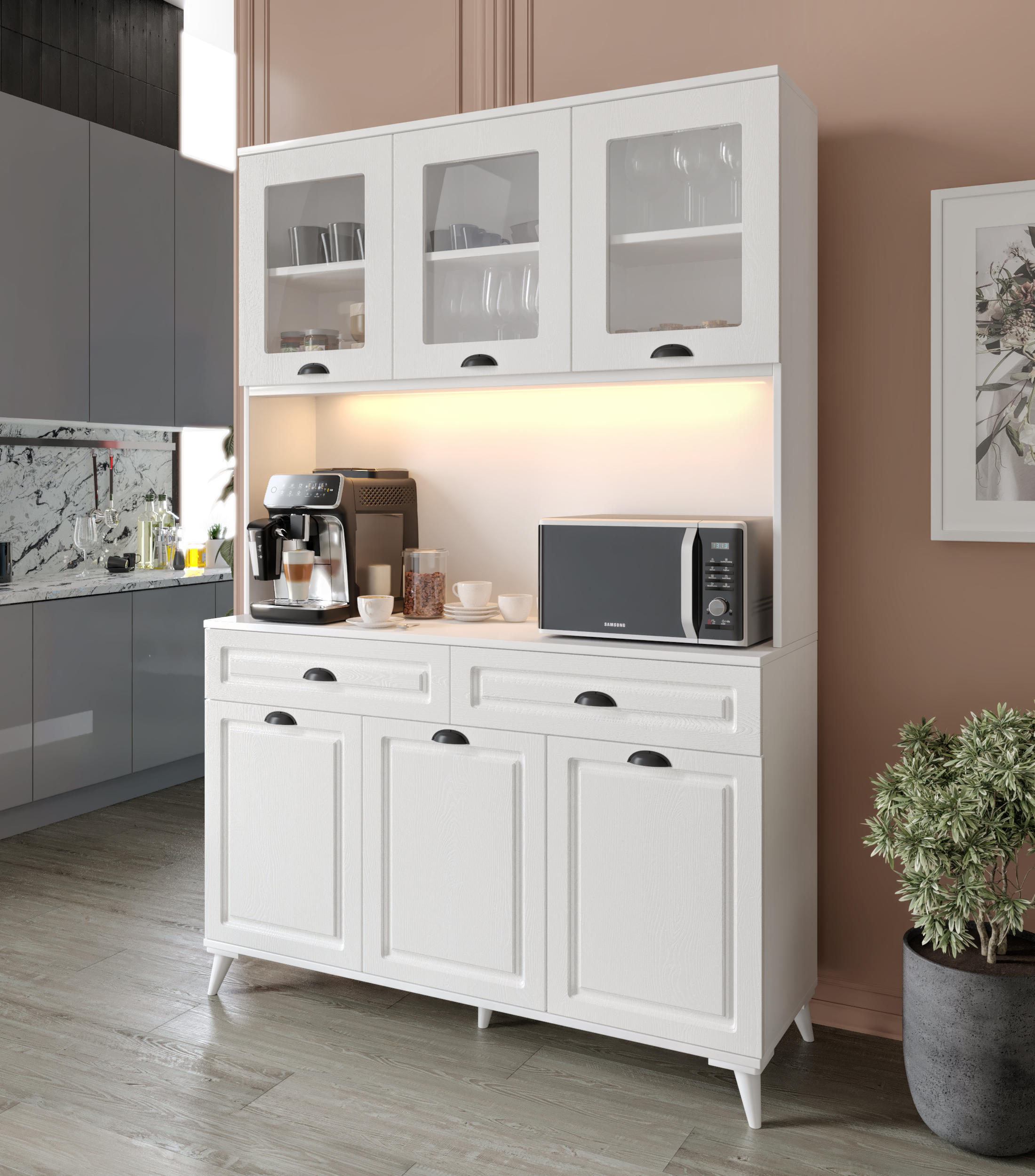 Luna 140 cm Kahve Köşesi, işlevselliği ve estetiği bir araya getiren özel tasarımıyla mutfağınızda fark yaratır. Komple MDF gövdesi ve MDF üzeri membran kapaklarıyla uzun ömürlü kullanım sunarken, dokunmatik sensörlü LED aydınlatması ve 2 priz girişi ile kahve makinelerinden airfryer’a kadar tüm küçük ev aletleriniz için ideal bir kullanım alanı sağlar. Hem kahve köşesi hem çok amaçlı mutfak dolabı olarak tercih edilebilir.