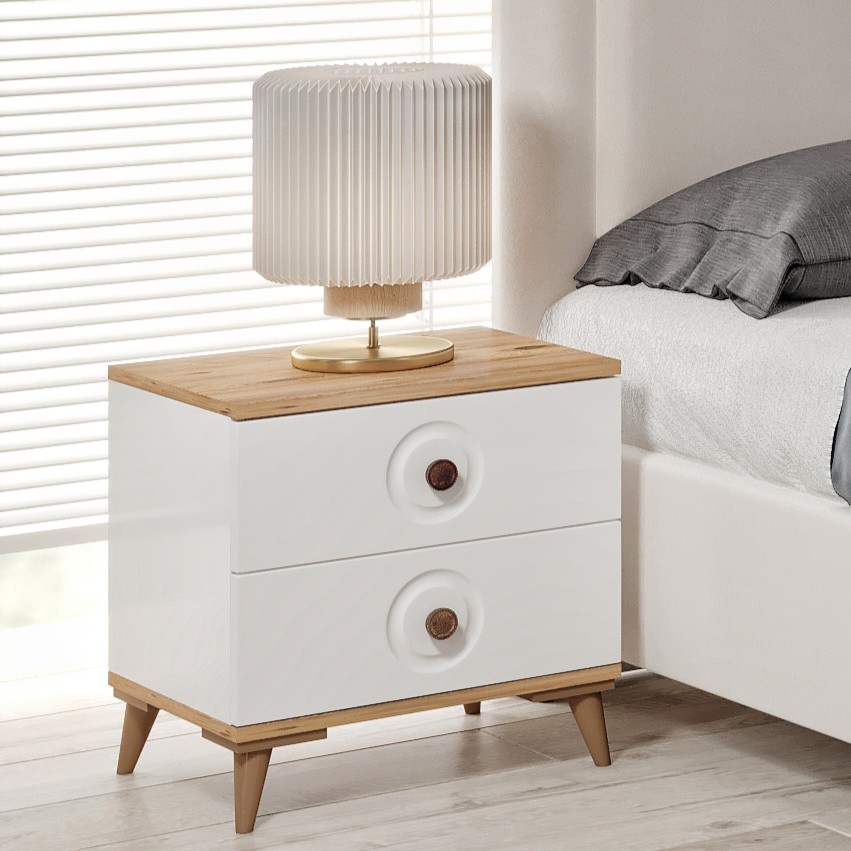 Nevada Atlantik Çam - Beyaz Komodin, modern yatak odalarının ihtiyaçlarına estetik ve fonksiyonel bir çözüm sunar. Tamamen MDF gövdesi ve şık beyaz membran kaplamalı yüzeyi ile uzun yıllar dayanıklılık sağlar. Frenli teleskopik raylı çekmeceleri sayesinde sessiz ve konforlu kullanım imkânı sunar. Minimalist tasarımıyla hem klasik hem modern dekorasyon stilleriyle uyum sağlar.