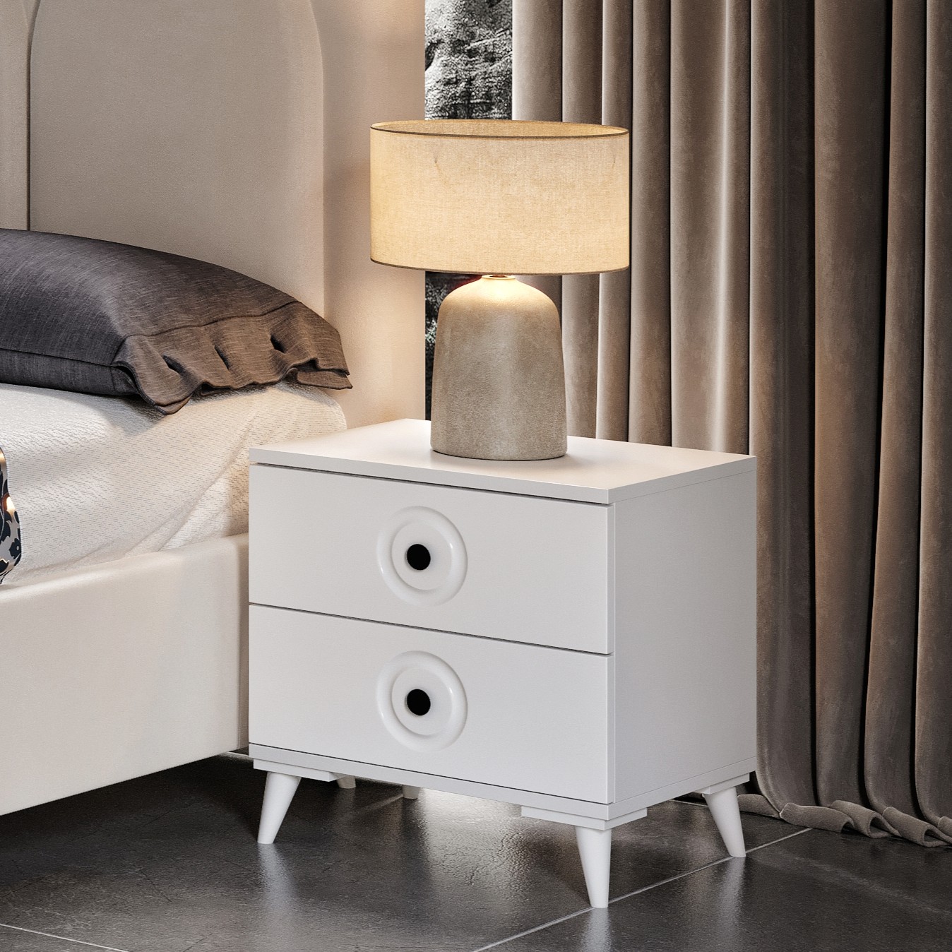 Oslo Beyaz Komodin, modern yatak odalarının ihtiyaçlarına estetik ve fonksiyonel bir çözüm sunar. Tamamen MDF gövdesi ve şık beyaz membran kaplamalı yüzeyi ile uzun yıllar dayanıklılık sağlar. Frenli teleskopik raylı çekmeceleri sayesinde sessiz ve konforlu kullanım imkânı sunar. Minimalist tasarımıyla hem klasik hem modern dekorasyon stilleriyle uyum sağlar.