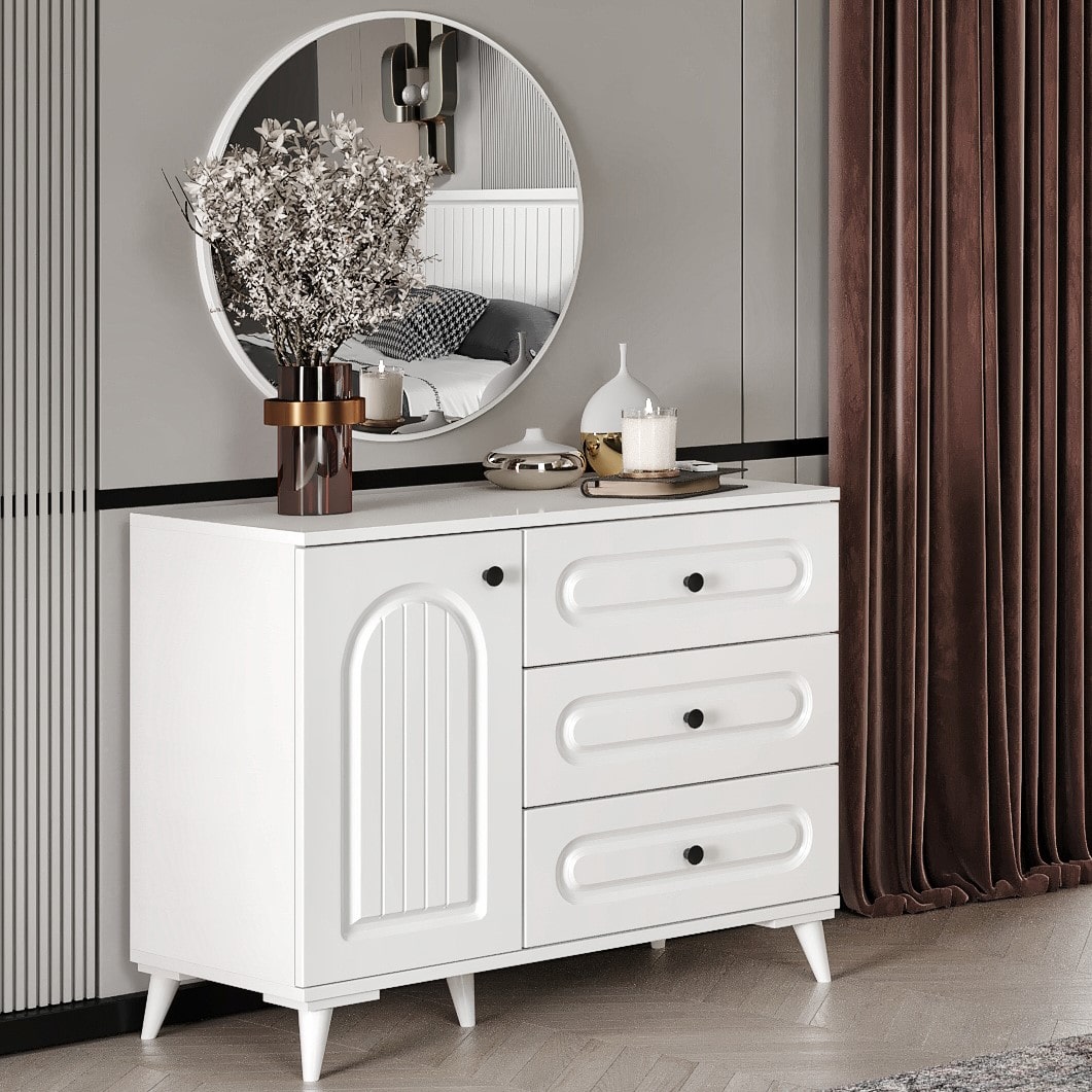 Roma Aynalı Şifonyer, yumuşak hatları ve sıcak tasarımıyla yatak odalarına zarif ve davetkâr bir atmosfer kazandırır. Mat beyaz dişbudak desenli yüzeyi, bohem stile özgü detaylarla birleşerek modern ve klasik dekorasyonlara uyum sağlar. Yuvarlak aynası fonksiyonel bir makyaj alanı oluştururken, 3 çekmeceli ve 1 kapaklı yapısı sayesinde günlük eşyalar için düzenli ve kullanışlı bir depolama alanı sunar.