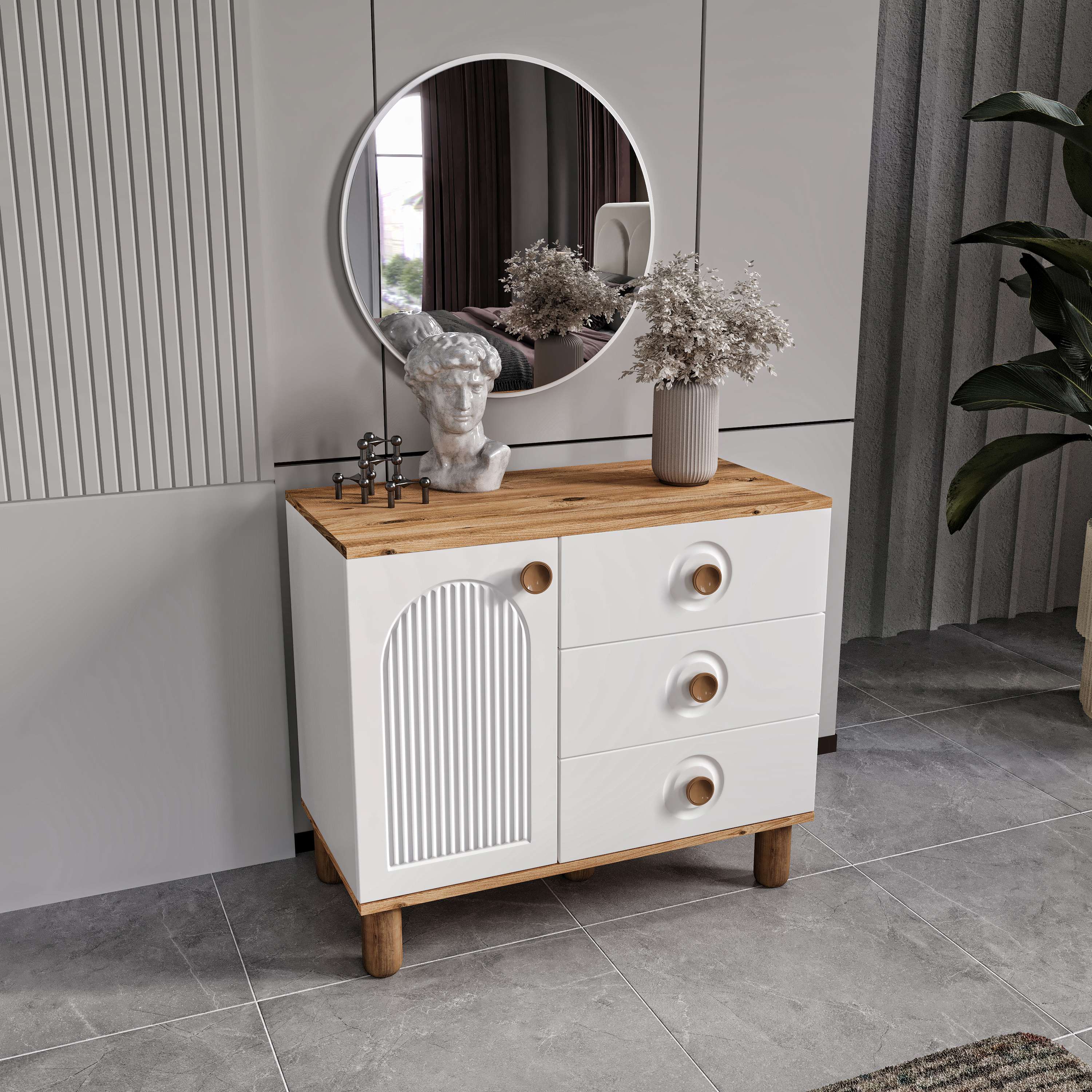 Rosa Aynalı Şifonyer, yumuşak hatları ve sıcak tasarımıyla yatak odalarına zarif ve davetkâr bir atmosfer kazandırır. Mat beyaz dişbudak desenli yüzeyi, bohem stile özgü detaylarla birleşerek modern ve klasik dekorasyonlara uyum sağlar. Yuvarlak aynası fonksiyonel bir makyaj alanı oluştururken, 3 çekmeceli ve 1 kapaklı yapısı sayesinde günlük eşyalar için düzenli ve kullanışlı bir depolama alanı sunar.
