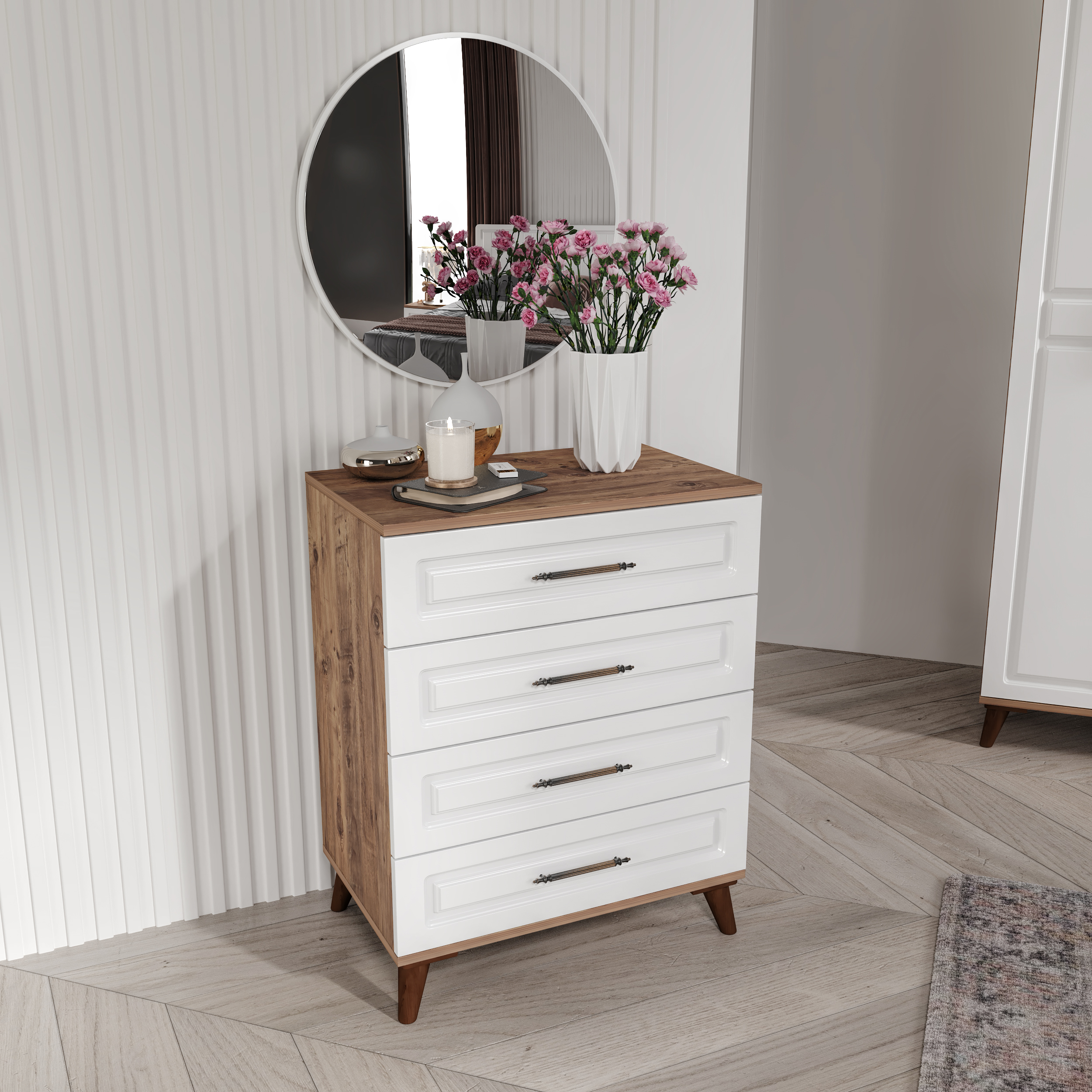 Sport Atlantik Çam Beyaz Aynalı Şifonyer, modern tasarımı ve sıcak ahşap dokusunu bir araya getirerek yatak odalarında dengeli ve şık bir görünüm sunar. Mat beyaz yüzeyi Atlantik çam detaylarla tamamlanırken, yuvarlak aynası hem estetik hem de günlük kullanım için fonksiyonel bir alan oluşturur. Üç çekmeceli yapısı sayesinde düzenli ve pratik bir depolama çözümü sağlar.