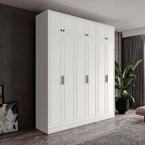 Milas 6 Kapaklı Yüklüklü Gardırop, şık ve sade çizgileriyle modern yatak odalarına kusursuz uyum sağlar. Geniş iç hacmiyle düzenli saklama alanı sunan bu model, tamamı MDF gövde ve kapak yapısıyla sağlamlık ve dayanıklılığı bir arada sunar. Üst bölümdeki yüklük alanı hacimli eşyalar için ek saklama alanı oluştururken, iç bölümdeki teleskopik raylı çekmeceler günlük kullanımı kolaylaştırır. Siyah renkli kulplarıyla güçlü ve modern bir duruş sergileyen kapaklar, pistonlu menteşe sistemiyle yavaş ve sessiz şekilde kapanır.