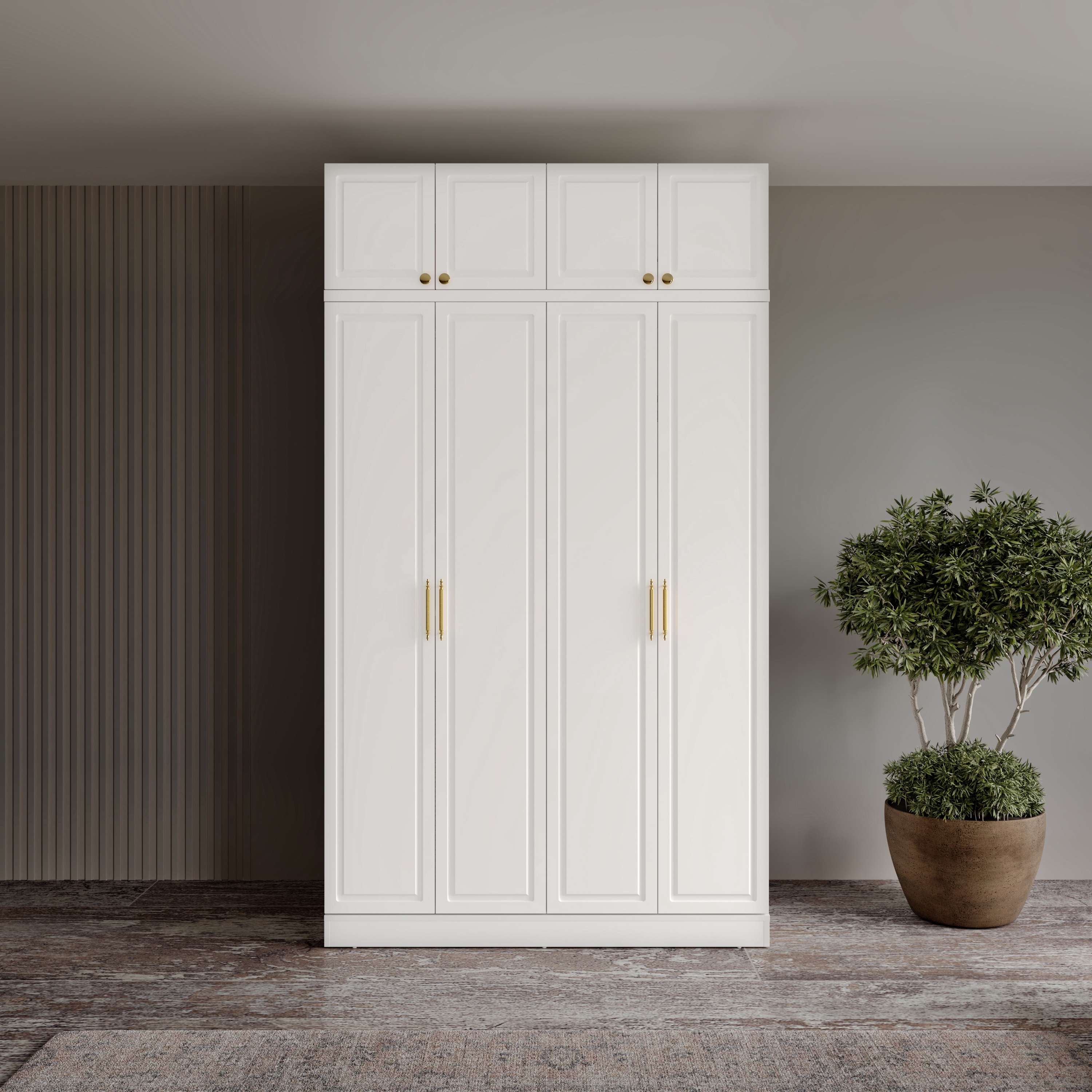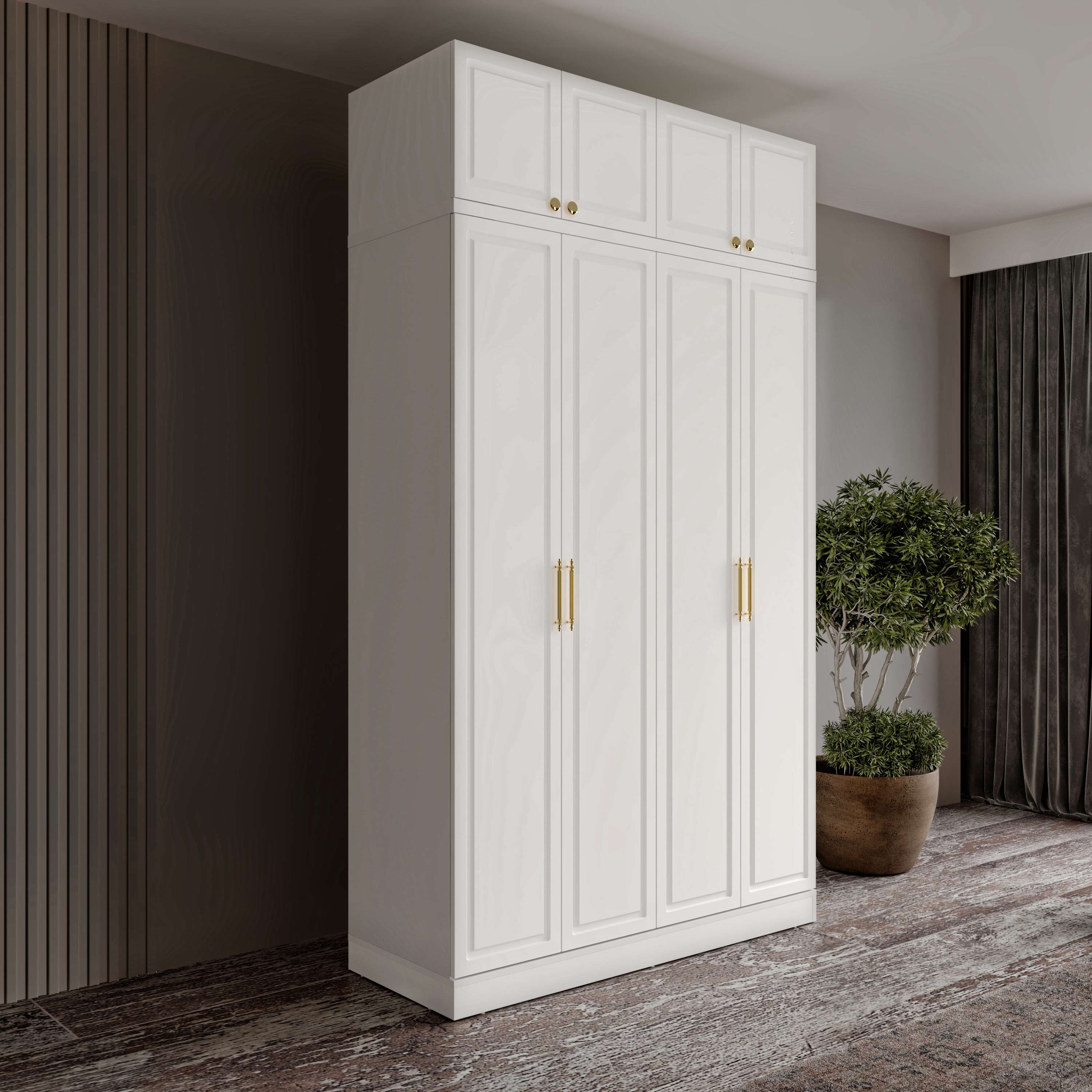Milas 4 Kapaklı Yüklüklü Gardırop, küçükten orta büyüklüğe sahip odalar için özel olarak tasarlanmış, estetik ve işlevsel bir depolama çözümüdür. Ayaksız yapısı ile duvarla tam uyum sağlarken, üst bölümdeki yüklük alanı sayesinde hacimli eşyalarınızı rahatça depolayabilirsiniz. Tamamı MDF malzeme ile üretilmiş gövde ve kapaklar uzun ömürlü kullanım sunarken, gold renkli kulplar tasarıma zarif bir dokunuş katar. Tüm kapaklarda pistonlu menteşe kullanılmıştır; bu sayede sessiz ve yavaş kapanır.