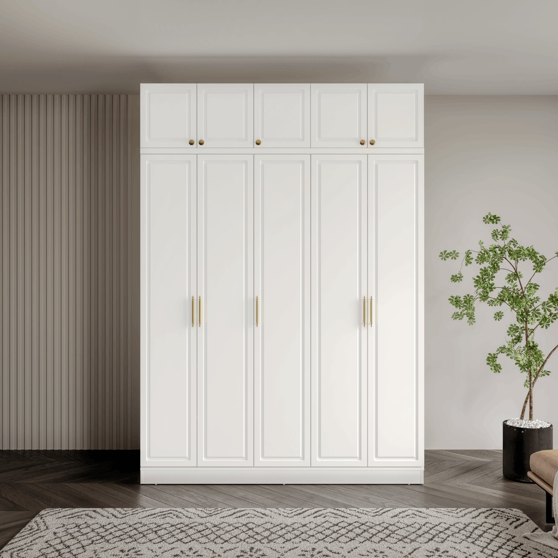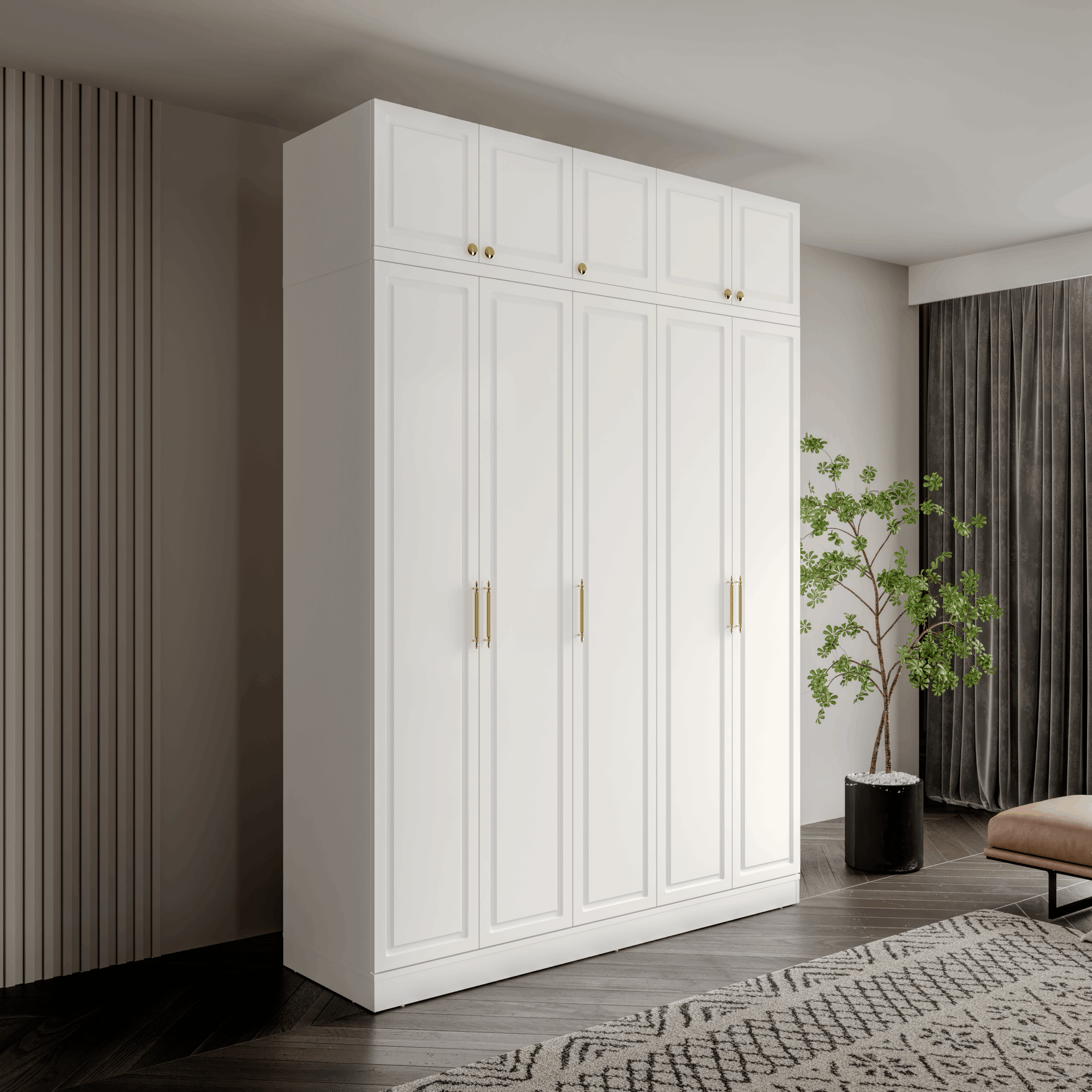 Milas 5 Kapaklı Yüklüklü Gardırop, hem şık hem de kompakt yapısıyla dar alanlarda geniş depolama çözümü sunar. Ayaksız ve düz tabanlı tasarımıyla duvarla bütünleşen modern bir görünüm oluştururken, gold renkli kulpları zarif bir estetik kazandırır. Üst bölümdeki yüklük alanı, mevsimlik veya hacimli eşyalar için ideal saklama alanı sunar. MDF gövde ve yavaş kapanan pistonlu menteşelerle uzun ömürlü ve konforlu bir kullanım sağlar.