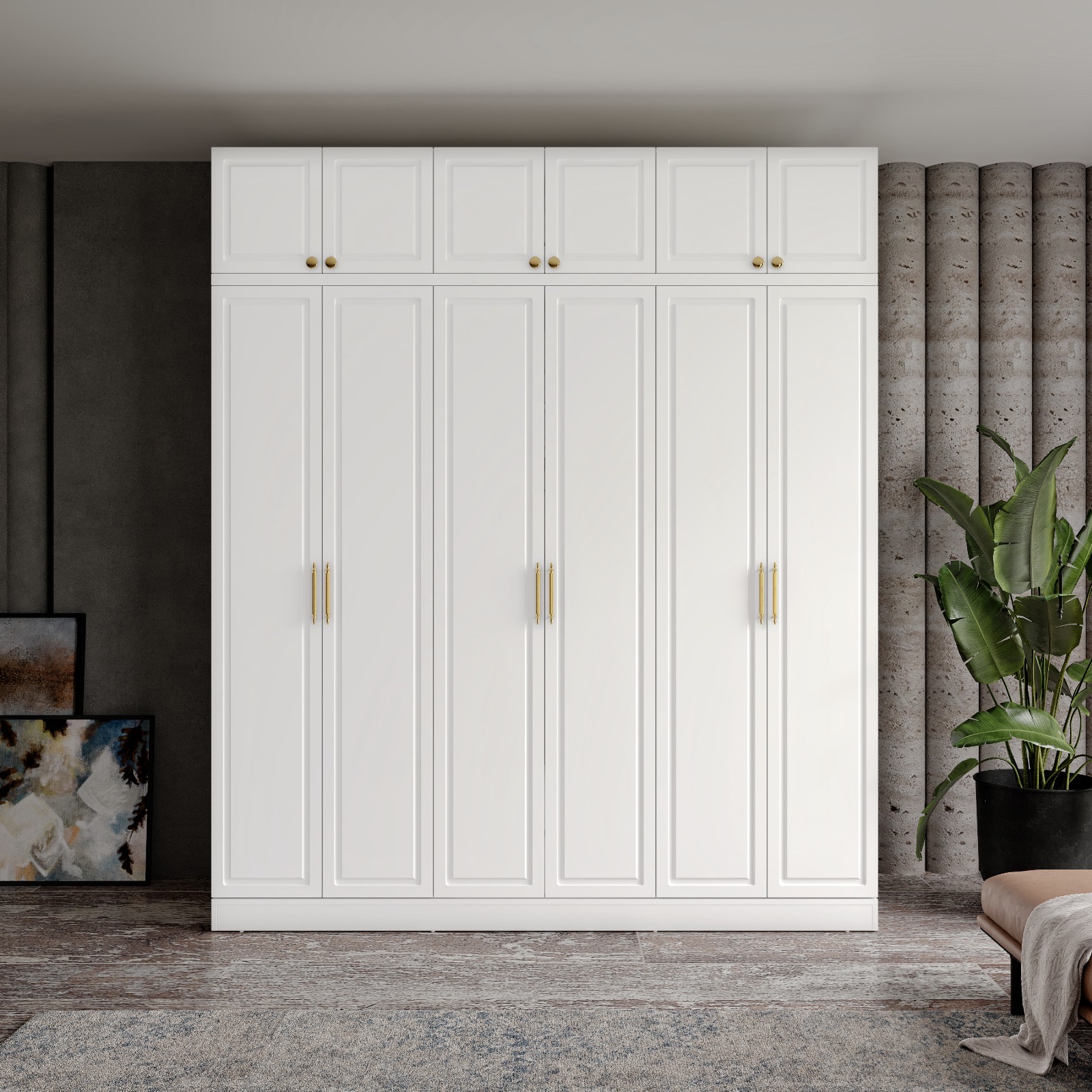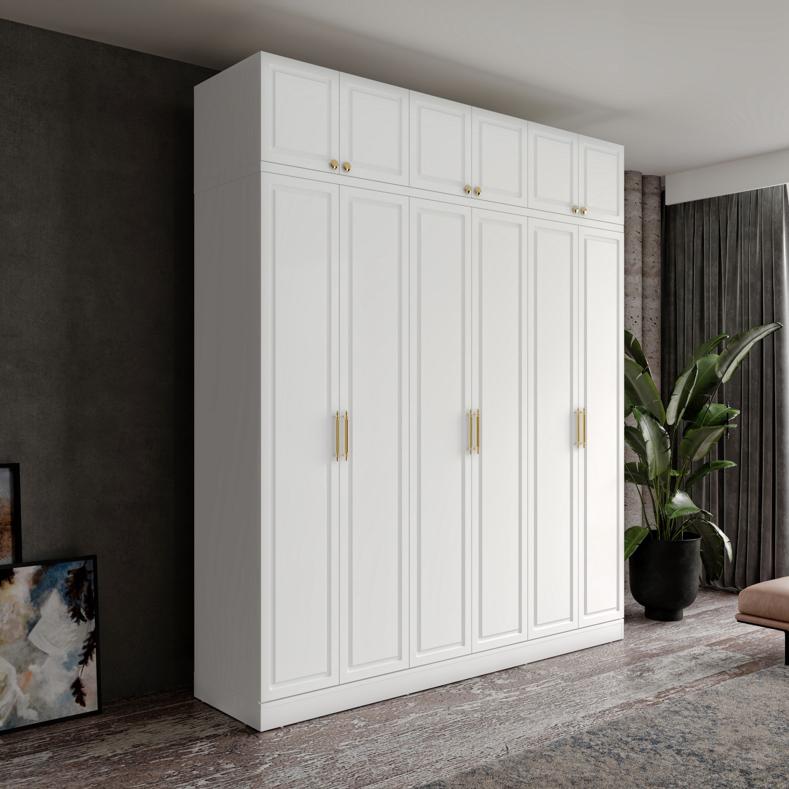 Milas 6 Kapaklı Yüklüklü Gardırop, şık tasarımı ve büyük iç hacmiyle geniş yatak odaları için mükemmel bir depolama çözümüdür. Tamamı MDF malzemeden üretilen bu model, zarif gold renkli kulpları ve ayaksız yapısıyla estetik bir görünüm sunar. Üst bölümdeki yüklük alanı mevsimlik ürünler için ekstra saklama alanı sağlarken, yavaş kapanan pistonlu menteşeler uzun ömürlü ve sessiz bir kullanım deneyimi sunar.